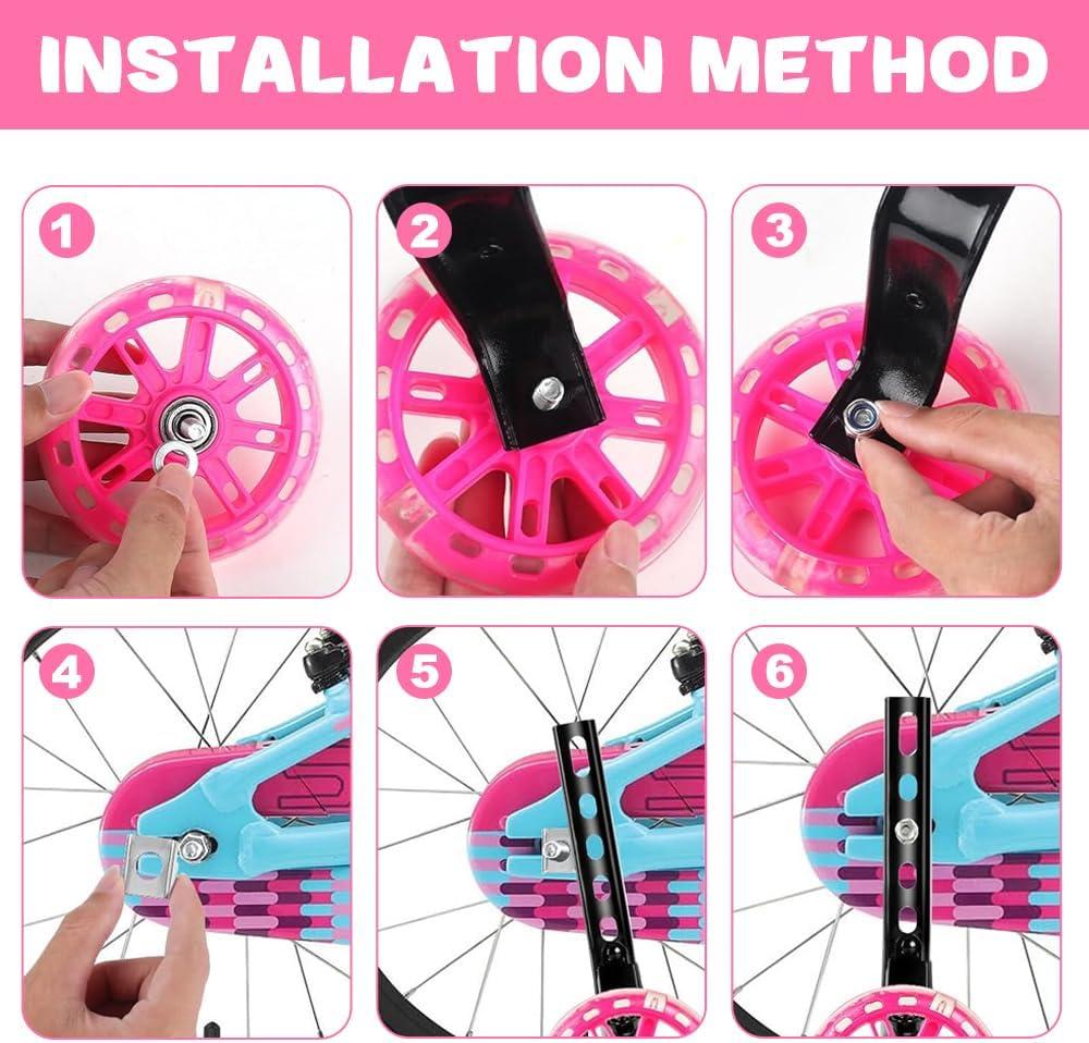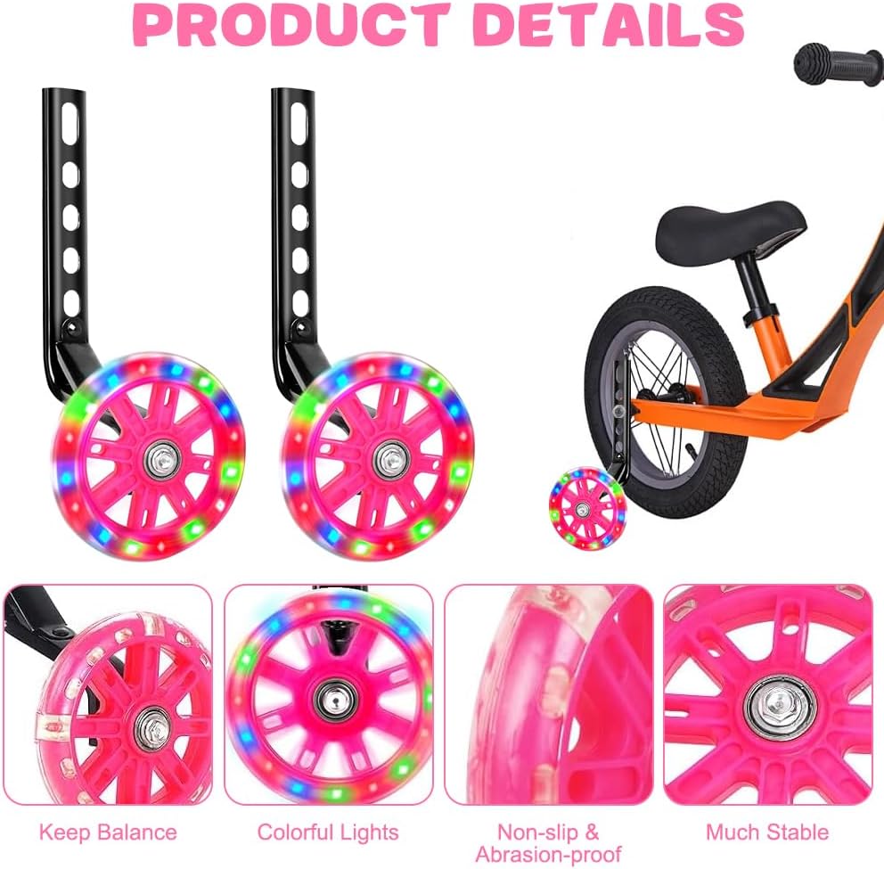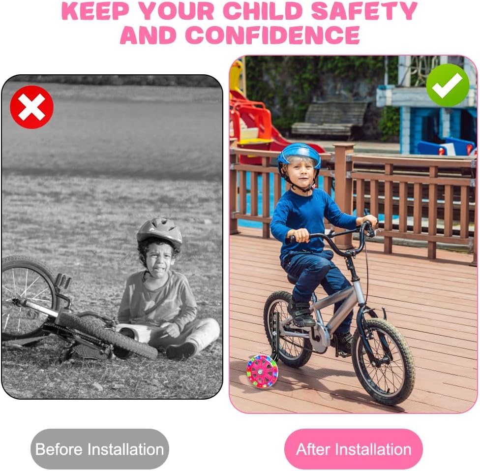 Safe and Stable:Designed for beginners cycling exercises to help learners develop a sense of balance on a bike. Bike stabilisers wheels help beginners maintain balance and provide greater safety and stability until they learn how to ride a bike. When riding, the wheels glow, making it more visible and safer to ride at night or in any dark environment