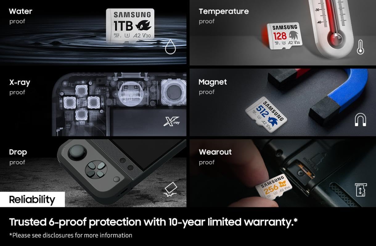 *The product is shown for illustration purposes only. ¹ Read and write speeds shown refer to tests performed internally under controlled conditions. Actual speeds may vary depending on card capacity. ² Stated performance is achieved when using the microSD PRO Plus card with Samsung drives. ³ The application performance symbol enables a new method of communication in the SD memory card market, providing a method for manufacturers to communicate device requirements and allowing customers to select the most suitable card for their device at the point of sale.* UHS-I speed classes (U1, U3) and video speed classes (V10, V30) are defined by the SD Association based on the minimum sequential write speed of the memory card. For more information, please refer to the SD card specifications. ⁴ Tested on Nintendo Switch with more than 45 games installed, with an average of 20 GB per game. The number of games stored may vary depending on game size, updates and downloadable content. ⁵ Water resistance: withstands up to 72 hours in 3% saline solution up to 1m depth*1TB: withstands up to 24 hours in 3% saline solution up to 1m depth. ⁶ Temperature resistance: Operating temperatures from -25 °C to 85 °C; non-operating temperatures from -40 °C to 85 °C. ⁷ Resistance to X-rays: up to 100 mGy, the equivalent of the X-ray detectors used at airports.⁸ Up to 15,000 gauss (magnetic field equivalent to a high-field MRI), 30 seconds. ⁹ Drop resistance: withstands drops of up to 5 metres in height, 10 cycles*1 TB: 1.5 metres, 10 cycles*The results of the various endurance tests were obtained in a strictly controlled laboratory environment, as detailed in the footnote for each test. Test results are for informational purposes only and are provided ‘as is’ without promise of any kind, expressed or implied, including but not limited to the implied promises of merchantability and/or fitness for a particular purpose. Any attempt to replicate such results is not covered under Samsung’s coverage and Samsung disclaims all liability for any damages resulting from such attempts, including, without limitation, damage to products, loss of property, or loss of data. For more information on Samsung’s coverage policy, please visit the official website. *Results refer to the microSD card and do not include the adapter or reader. ¹⁰ The Samsung Magician software is available on Windows and macOS. A Windows 10 and later operating system or macOS High Sierra (10.13) and later versions are required. Earlier versions of Windows and macOS operating systems may not be supported.