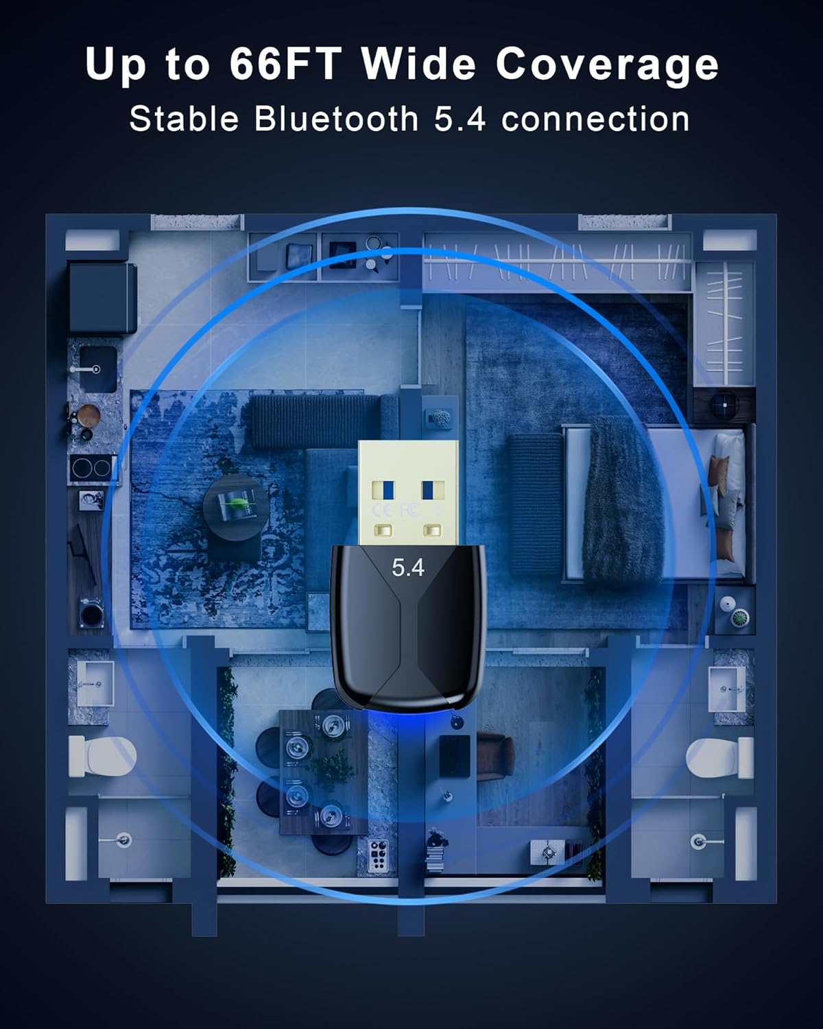 【Strong Signal, Stable Transmission】With outstanding anti-interference performance, this bluetooth adapter for pc offers a transmission range of 10-20 meters in open spaces, ensuring stable connectivity without signal interruptions. Whether for work, entertainment, or gaming, it provides smooth and lag-free wireless transmission.