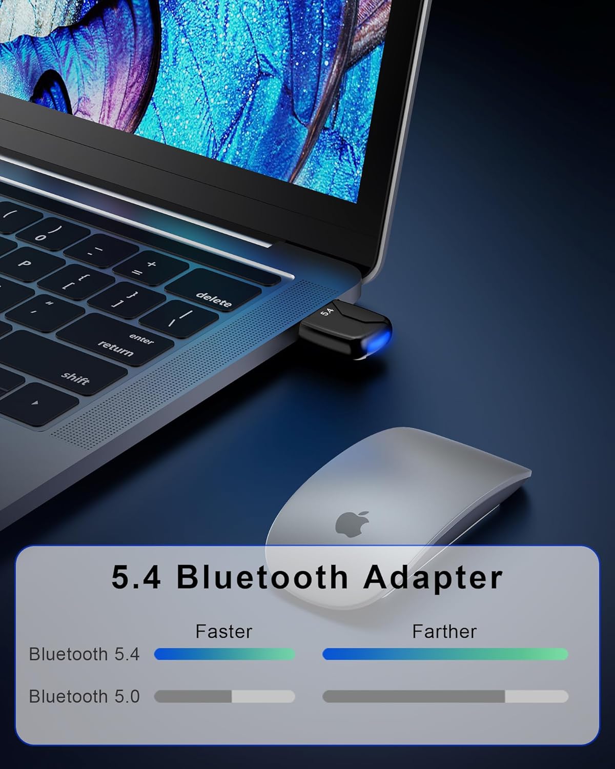 【Bluetooth Dongle 5.4 Technology, Superior Performance】This bluetooth adapter for pc features the latest Bluetooth 5.4+EDR technology, offering super-fast data transfer speeds of up to 3 Mbps and significantly reducing power consumption. It is backward compatible with Bluetooth 2.0/3.0/4.0/5.0/5.1/5.3 devices, ensuring stable wireless connections with excellent anti-interference capabilities.