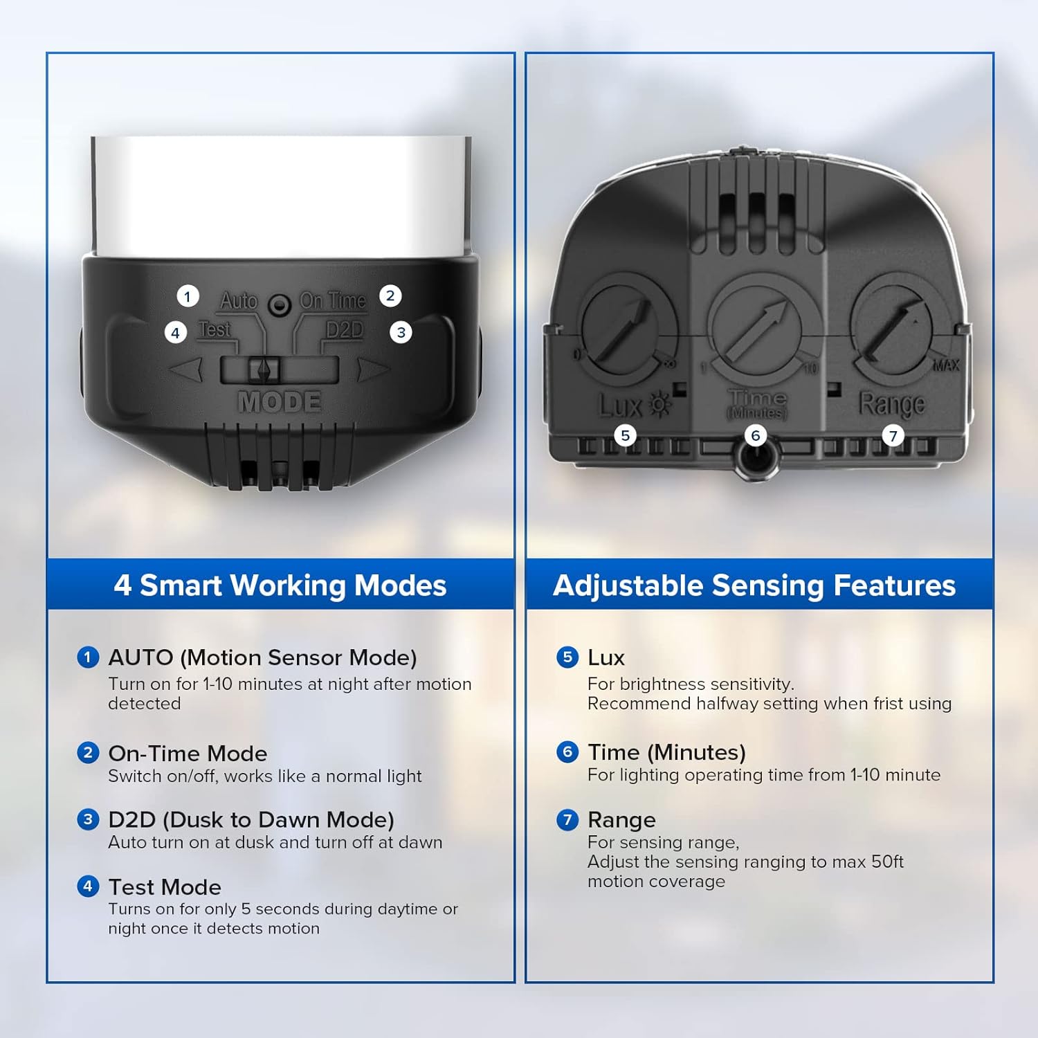 FUNCTIONAL DUSK TILL DAWN SECURITY LIGHT: This outdoor led motion sensor light with built-in infrared detector supports a max detection range of 50ft. 4 modes (Auto, D2D, Test, On Time) and 3 bottom knobs (LUX, TIME, SENS) can meet different needs.