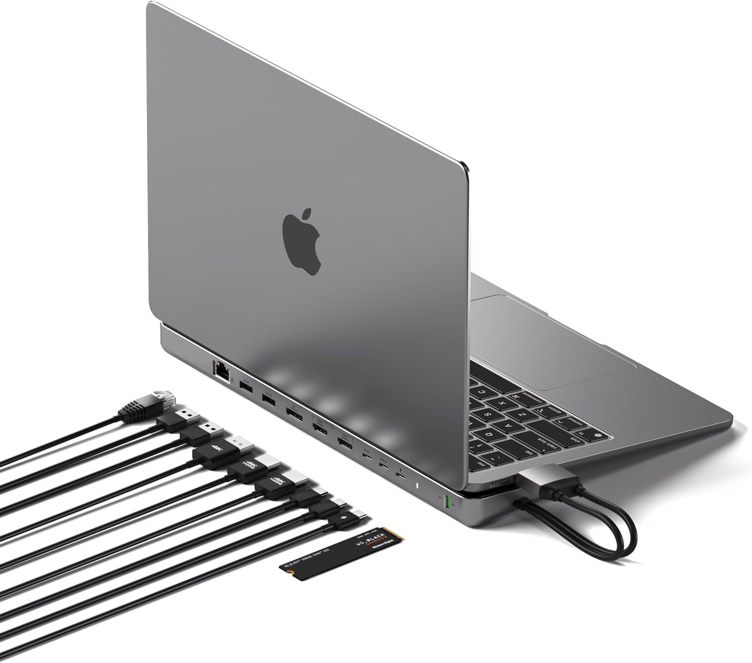 If you want a dual usb-c dock for your mac this is it. Works with both air and pro. All the ports you need and the facility to install an nvme m.2 inside the dock is great. Need a usb-c power supply but the mac air works with it. Very pleased with this.