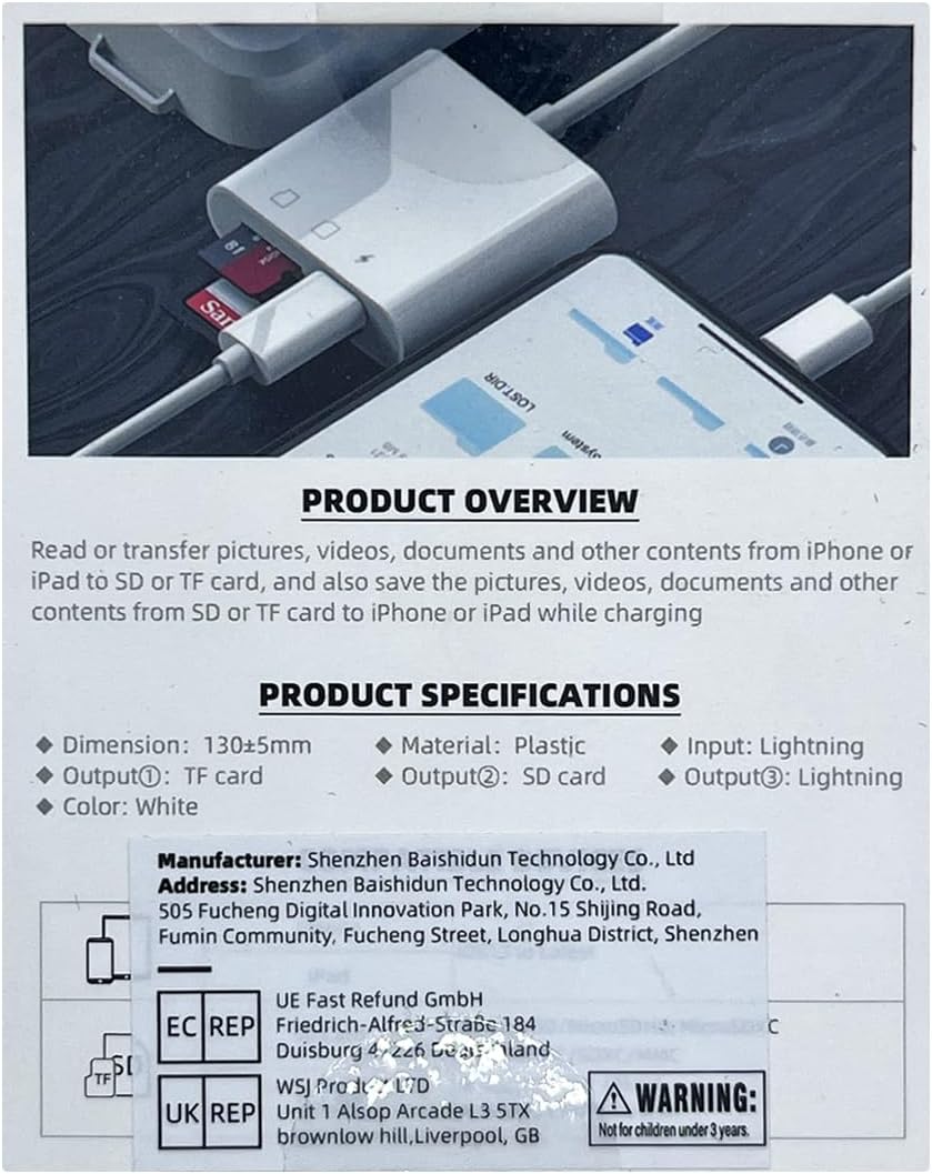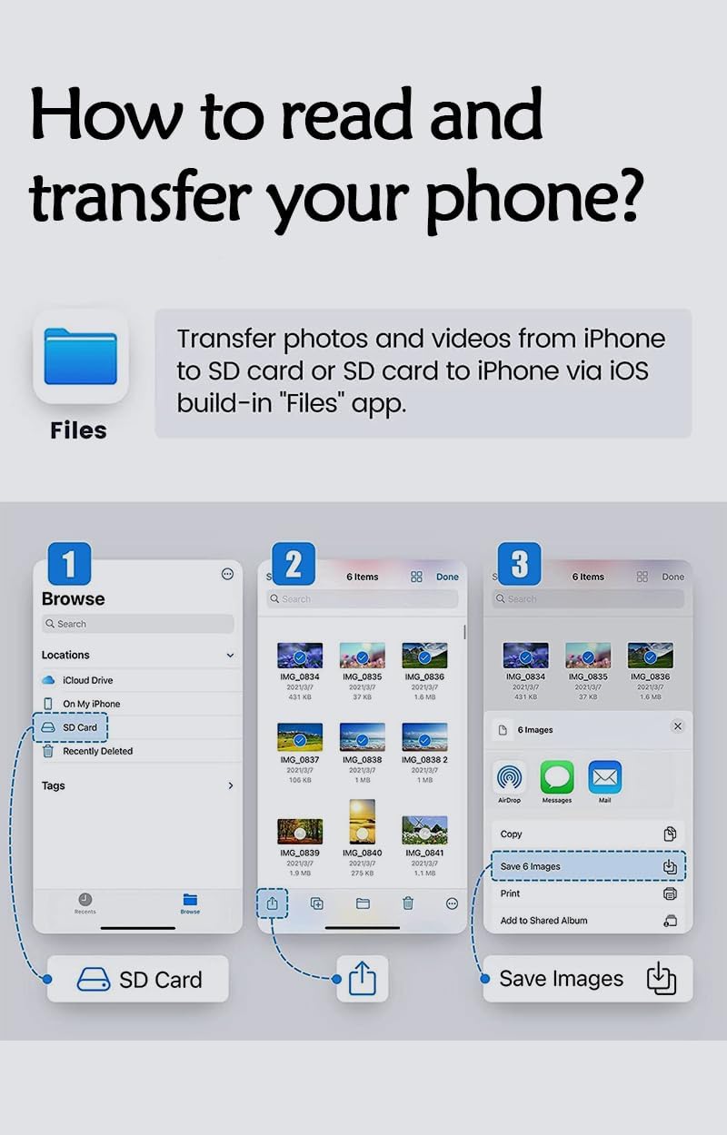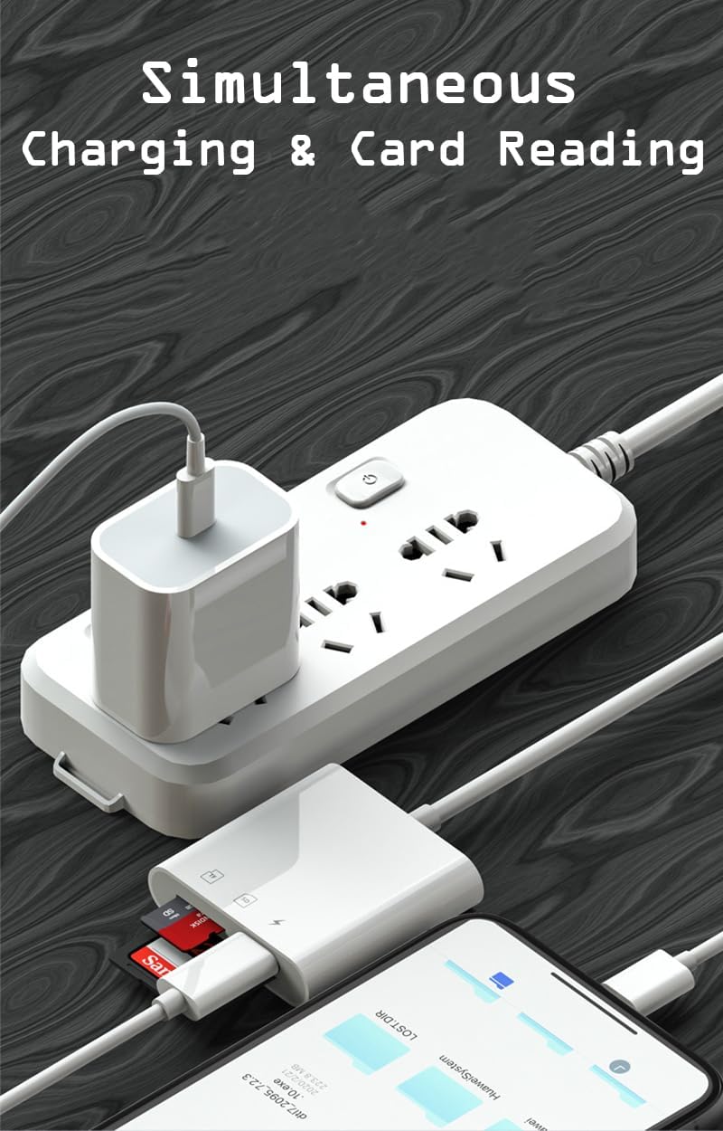 Two-way transfer: The SD Card Reader for iPhone supports two-way transfer, from SD card to iPhone or iPhone to SD memory cards.