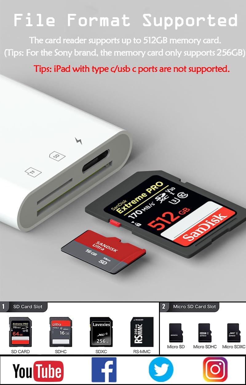 Double duty & Raw files: The iPhone SD Card Adapter is compatible with SD, SDHC, SDXC, MicroSD, MicroSDXC, and MicroSDHC memory cards, The SD Card Reader supports standard photo formats including JPEG, RAW, and 4K video formats including H.264 and MPEG-4.