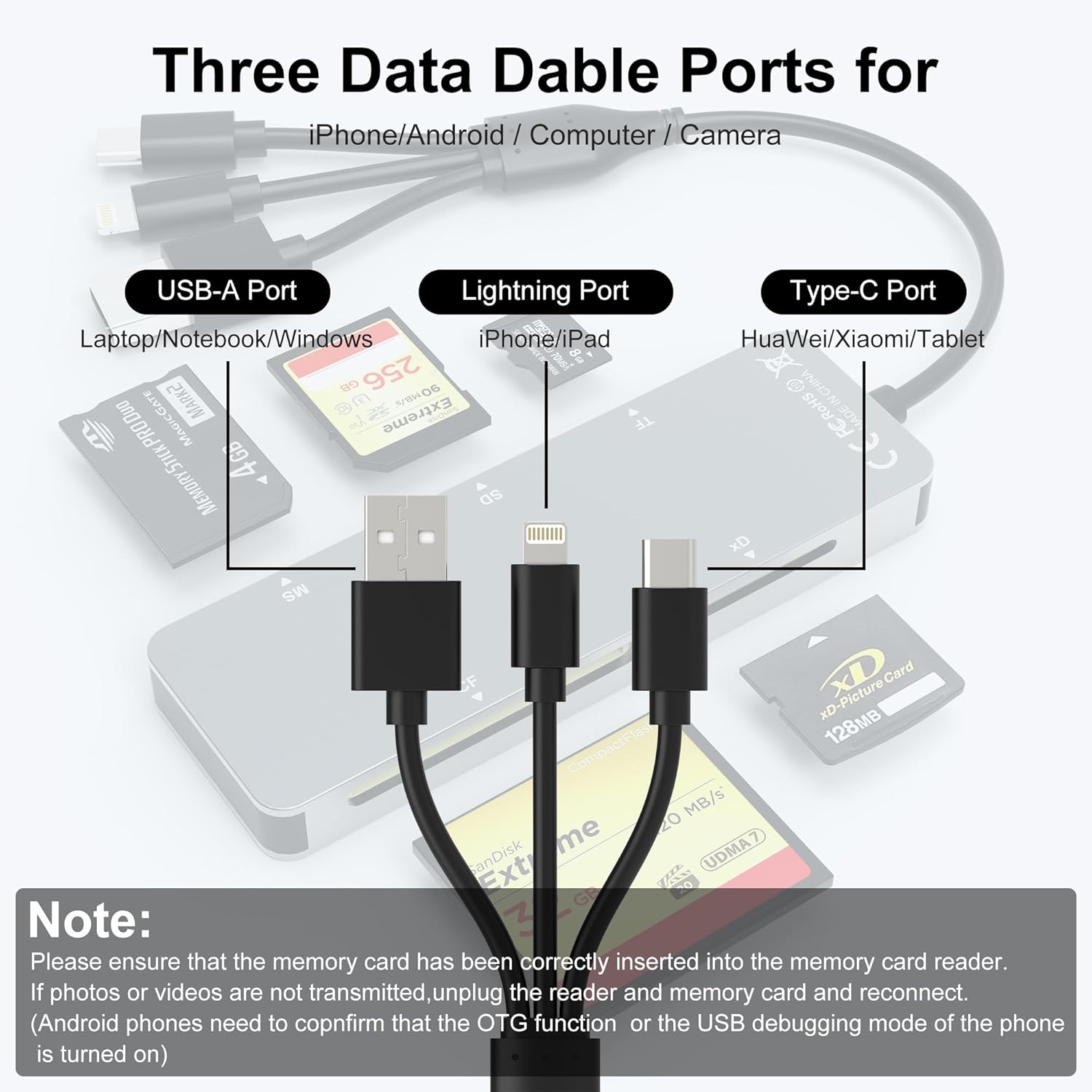 The memory card adapter has Lightning+USB C+USB A data transfer ports, which are suitable for iPhone/iPad computer, etc.