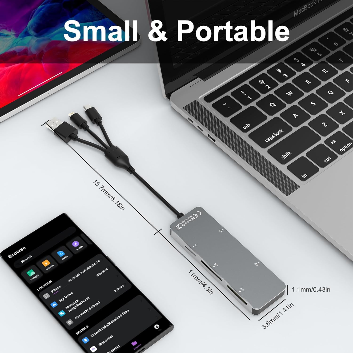 [5 in 1 USB C SD Card Reader]: This compact flash card reader is equipped with SD/TF/MS/CF/XD card slots. Supports XD, SDXC, SDHC, SD, CF, MS, Micro SDXC, Micro SDHC, Micro SD cards etc. The 5 in 1 design greatly saves space and makes your desktop more tidy. [Three Data Dable Ports]: The memory cards adapter features Lightning+USB C+USB A data dable ports suitable for i-Phone/i-Pad computers, etc devices. The 15cm cable leaves more space for the other ports without blocking them.