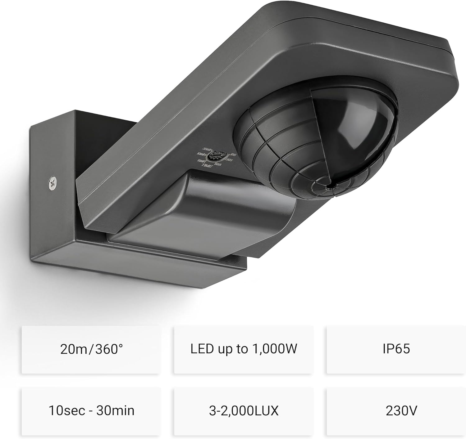 Customizable Settings – The duty cycle is 10 seconds to 30 minutes or permanently on or off. The PIR sensor can also be set according to the ambient brightness (3-2,000 LUX).