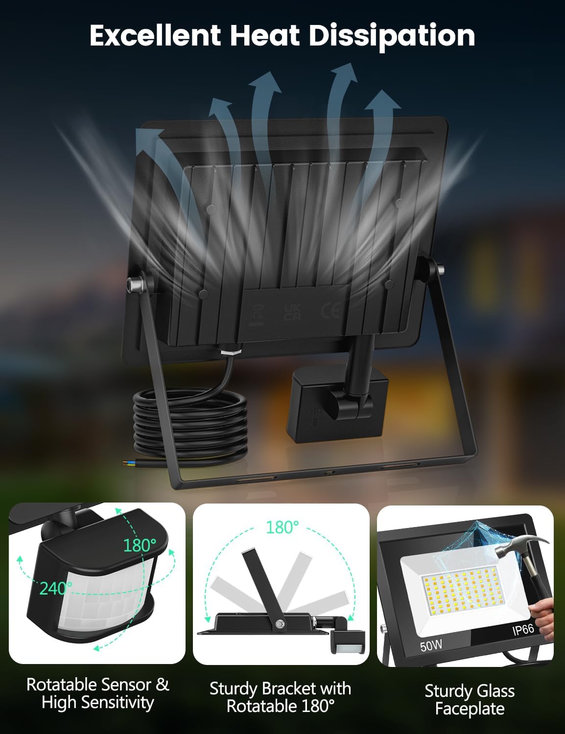 【Durable & Energy Saving】-The 50W security light mains powered can replace an old style halogen spotlight that was 500 watts, saving more than 85% of power, saving money on your electric bill. The outside lights are constructed from die-cast aluminum material and tempered glass, Aluminum alloy shell brings good heat dissipation performance and corrosion resistance, which makes it more durable, with a service life of up to 50,000 hours.