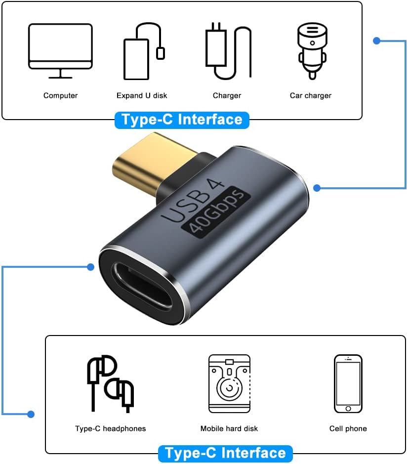 Seminer USB C Male to Female Adapter, USB C 90 Degree Angled Adapter Type C Adapter Data Transfer Connector (8K@120HZ) This adapter supports up to 8K@120HZ, the resolution is 7680×4320, and the resolution is four times that of 4K, allowing you to enjoy a visual feast (Type-C 40Gpbs) USBC adapter transmission speed is 2700MB/S, 10GB file only takes 5 seconds, supports 40Gpbs transmission + 8k video transmission + PD100W charging, improve work efficiency (High-quality Material) Type-C to Type-C adapter is made of aluminum alloy, which is not easy to abrasion, dissipates heat quickly, and prolongs service life (Wide Compatibility) USB C 4.0 adapter Compatible with Macbook(Pro), Samsung Note 8/ Note 9/ S20/ S10/ S10+/ S9/ S8, Google Nexus 5X/ 6P, Pixel C, Chromebook Pixel 3XL-XL, OnePlus 2-6T and more USB-C devices (Suitable for Small Spaces) Seminer USB-C right angle adapter is slim and sturdy, ideal for small spaces behind a computer, monitor, or anything close to the wall.