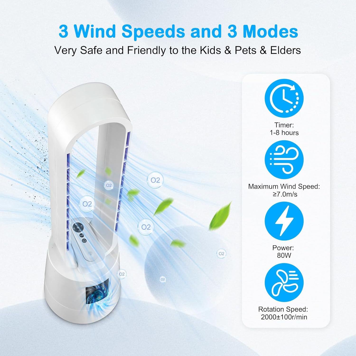 【Powerful Meets Portable】: Bladeless Tower Fan all-in-one airflow system combines with a supercharged electric motor, delivering high-speed, brisk cool. This 38-inch 80W compact bladeless tower fan enlivens every inch of air in your living space fast at up to 7m/s.