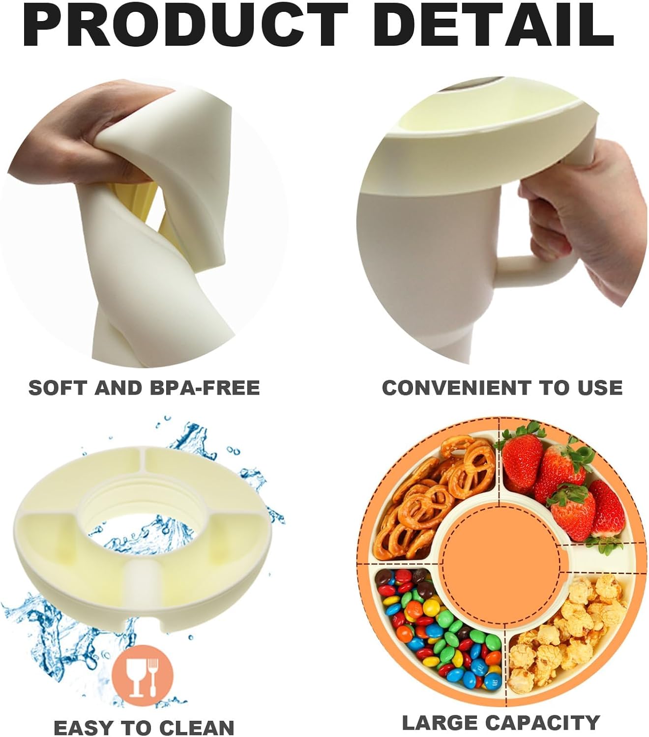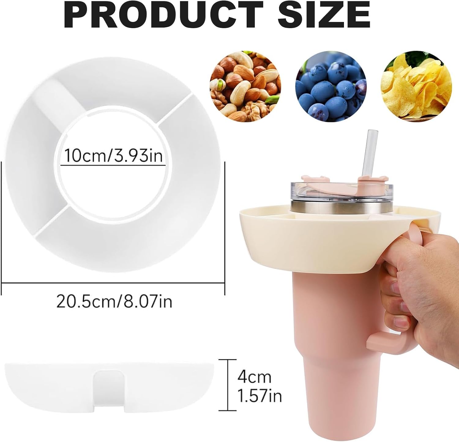 【Unique Design】This snack bowl features four independent compartments, effortlessly accommodating a variety of snacks like popcorn, chips, candies, and more. It pairs perfectly with Stanley 40oz 1.0/2.0 cups, but if you plan to use it with other cups, please measure the cup’s diameter first.