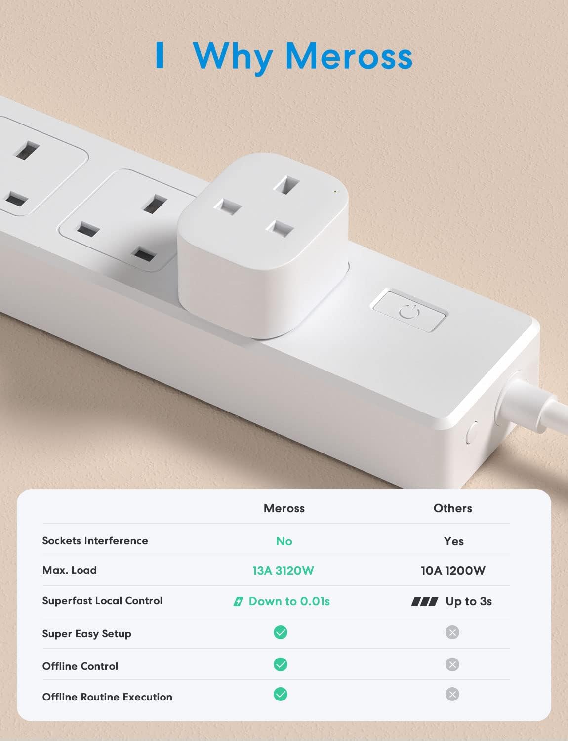 Alexa Mini Smart Plug – meross mini smart plug is the thinnest one in the market; It fits into UK wall socket and won’t interfere with the switch; It won’t block other socket when it is plugged in a power strip
