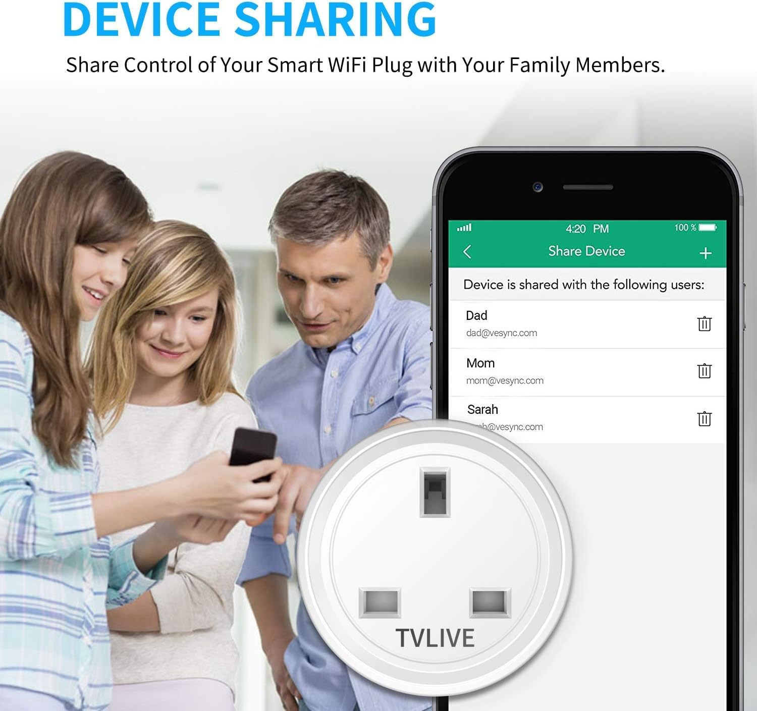 ✅【REMOTE CONTROL】 – Instantly Control devices connected to TVLIVE WiFi Smart Plug wherever you have Internet by using the Free “VeSync” app on your smartphone. Enjoy peace of mind by checking on your devices remotely and always coming home to a well-lit house. In addition, you could share your smart plug outlet with your other family members. No more worries, everyone can control it easily(★Not compatible with the “Smart Life” application)