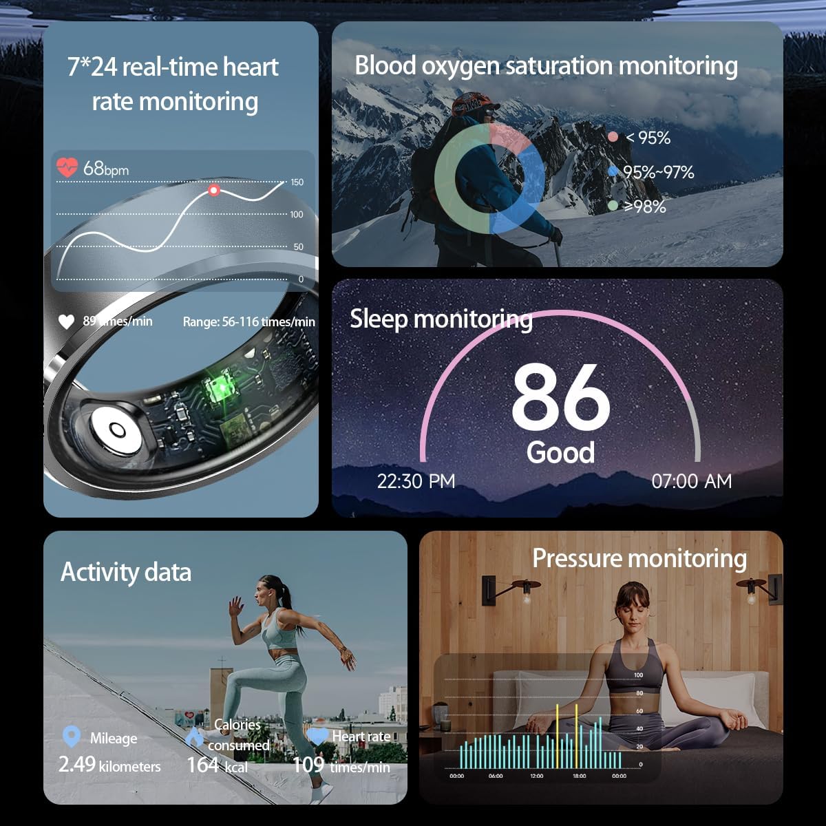 Health Smart Ring: The health ring can monitor your hear rate, blood pressure and blood oxygen at any time with one click on the App, allowing you to better understand your physical condition and make corresponding adjustments.