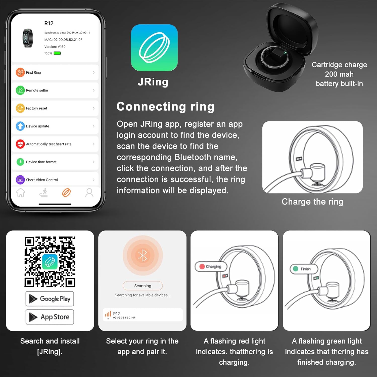 I received this ring today and already, I’m in love with it.I charged it up straight out of the box and it went from 0-100% in less than about an hour.I used the provided cable to charge it as the charging case also required charging.Once it was charged, I downloaded the JRing App and followed the instructions.It was simple and quick to connect to my phone via Bluetooth.I enabled certain permissions, such as health and the ring was ready to wear.I love that the LED screen enables me to see all the data without having to look at my phone. Just a series of taps on thesmall dial on the top, and it will show, time, steps, heart rate, Blood oxygen level, sleep data, and battery life.The ring is comfortable to wear, although I could feel it if I were writing with a pen, but I soon got used to that.It isn’t heavy or overly bulky. It’s about the size of a man’s ring.It’s important for the ring to fit snugly in wear to enable the sensors to work accurately, so getting the right size is a must.When measuring the finger, make sure the cotton or tape is a little tight, but not too much. You want to get it off again for charging!As for accuracy, I compared it with my Apple Watch and the readings were the same. So I am satisfied that the data is reliable.Best of all, compared to other far more expensive smart rings, there is no subscription with this ring at all. The app is free.There are some really good features on this ring as well, such as using it to take selfies, and using video mode, which enables you to use gestures to control scrolling, next song and etc on Tik Tok and YouTube. Very handyWhen I compare the cost of this ring to the expensive ones, I am blown away at how good this is and I’m very happy to recommend it.Because it has a visible screen, battery life is not as good as some without the screen; lasting about 3 days. But I prefer to be able see instant reports rather have to get my phone out and one an app.Should any problems arise, I will update the review.Highly Recommended