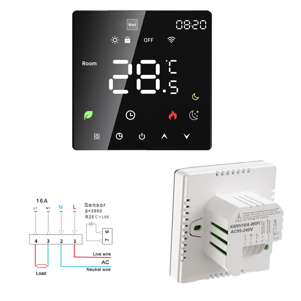 TLCD Touchscreen Display: he intelligent thermostat is equipped with an LCD color screen and an sensor, which offer precise and transparent temperature readings, enabling effortless monitoring of your surroundings.
