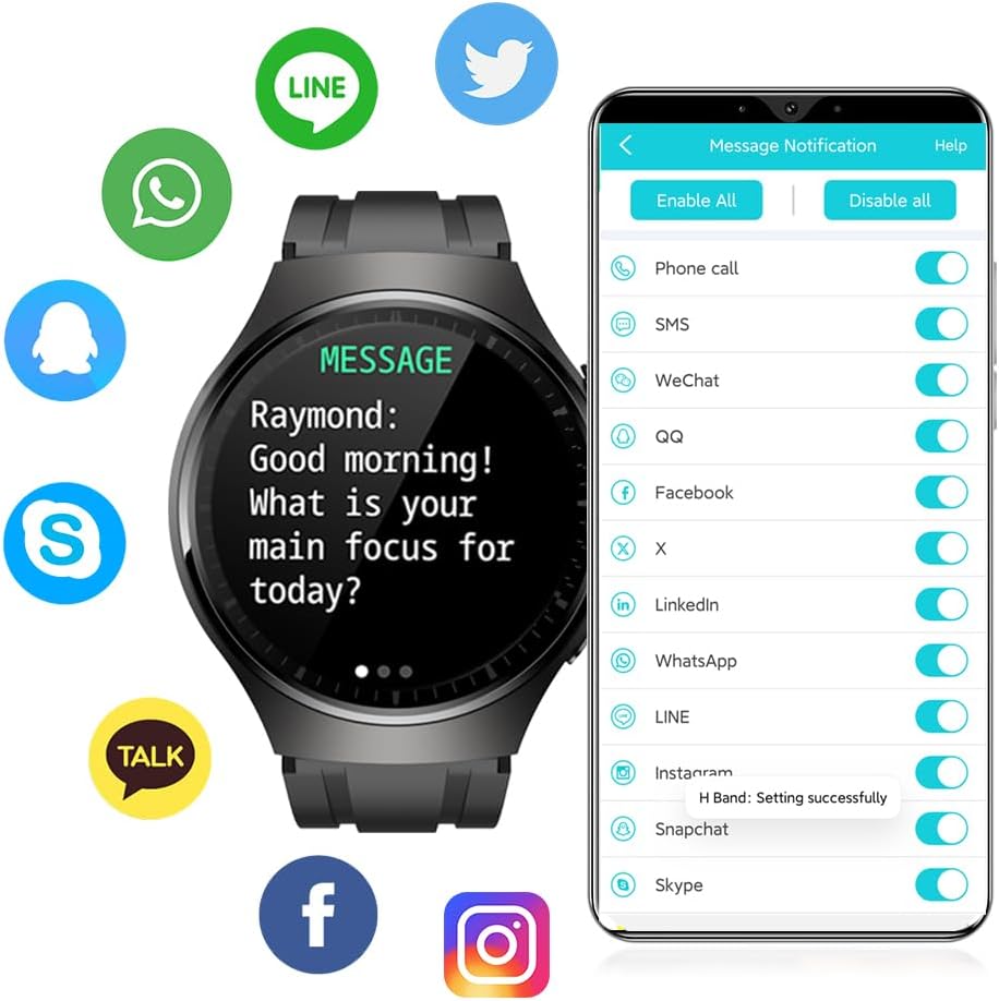 Sleep Monitor and Information Display: The Android smartwatch with sleep monitoring, when you fall asleep the smartwatch automatically calculates your sleep quality, and the data synchronization to APP Hband. You can know whether the sleep quality well or not. The information display function will show current weather, SMS, eMail, Masseger, Ins, Skype, Twitter, and other social tools.