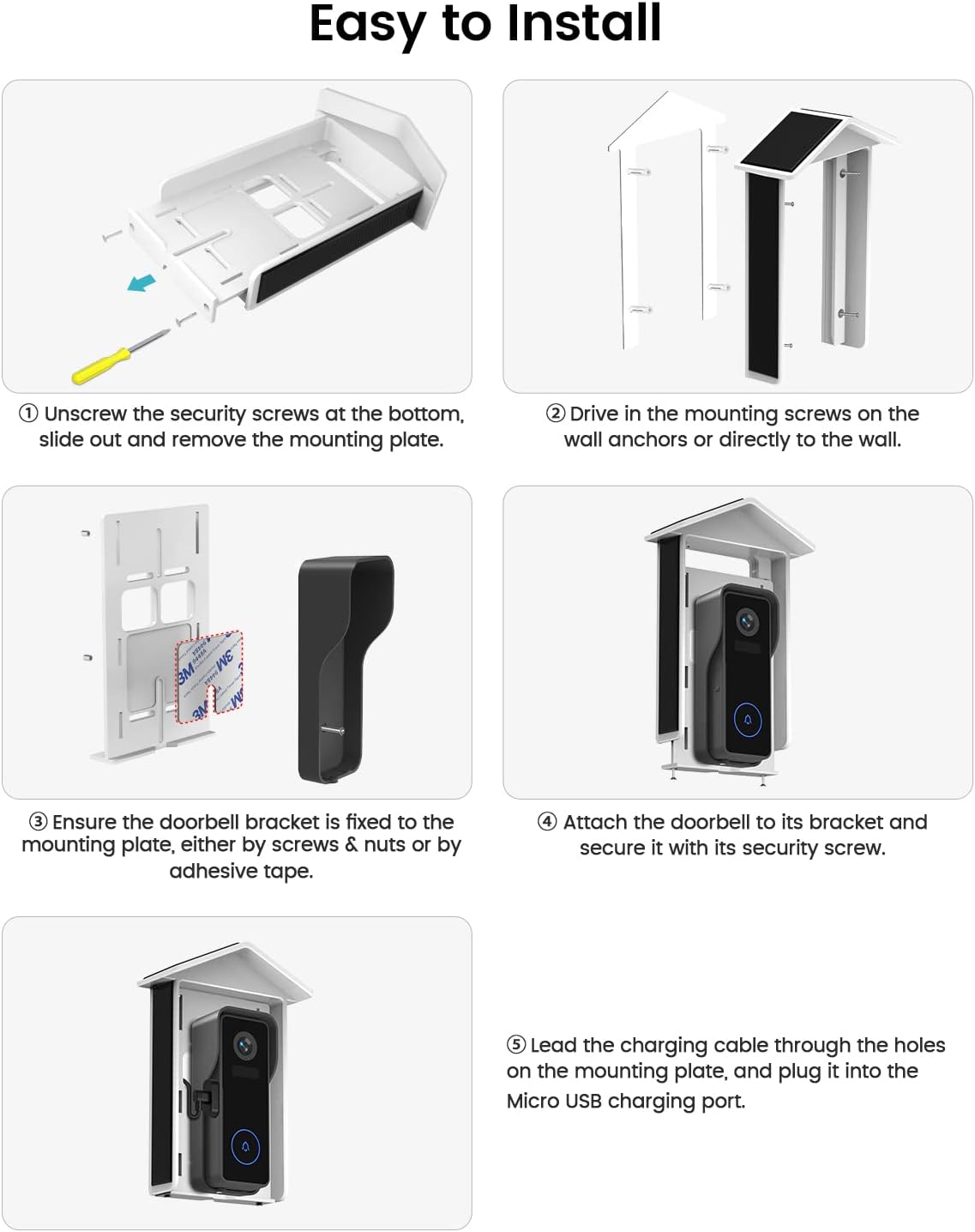 The solar charger for video doorbell can absorb sunlight, and offer a non-stop power supply for your battery video doorbell or battery outdoor camera. Connects to Video Doorbell for a continuous charge, so your Video Doorbell will stay charged around the clock.