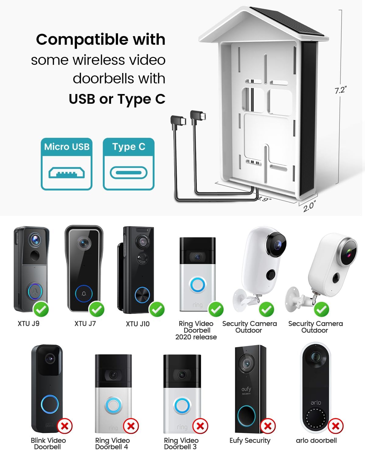 Universal Compatibility: Solar charger suitable for battery-powered devices that support the Micro USB interface. Such as Ring Video Doorbell 2020 Release, XTU J1,J7,J7PLUS,J9,J9Plus, J10, J10Plus video doorbell and security camera (with micro USB Charging Port).versal Compatibility: Solar charger suitable for battery-powered devices that support the Type-C interface. Such as J1/J7/J7Plus/J9/J9Plus/J10/J10Plus video doorbell and security camera (with Type-C Charging Port).