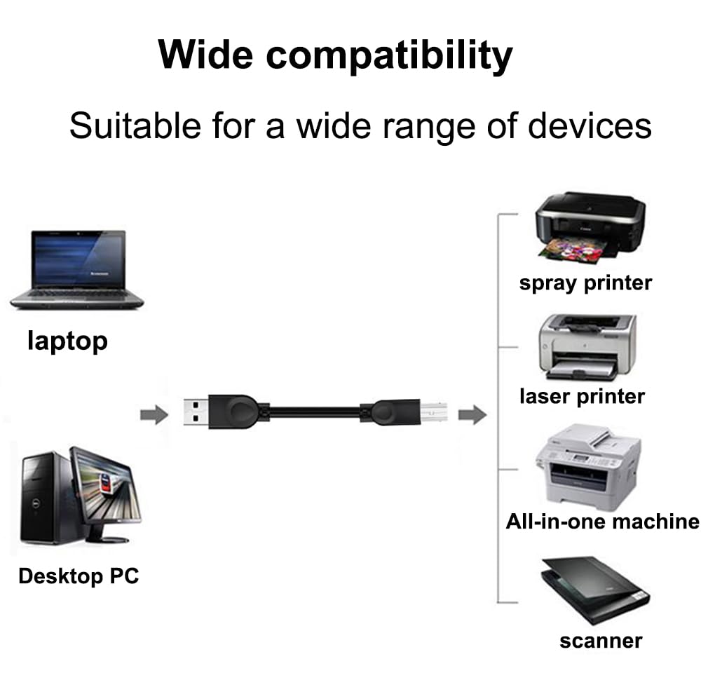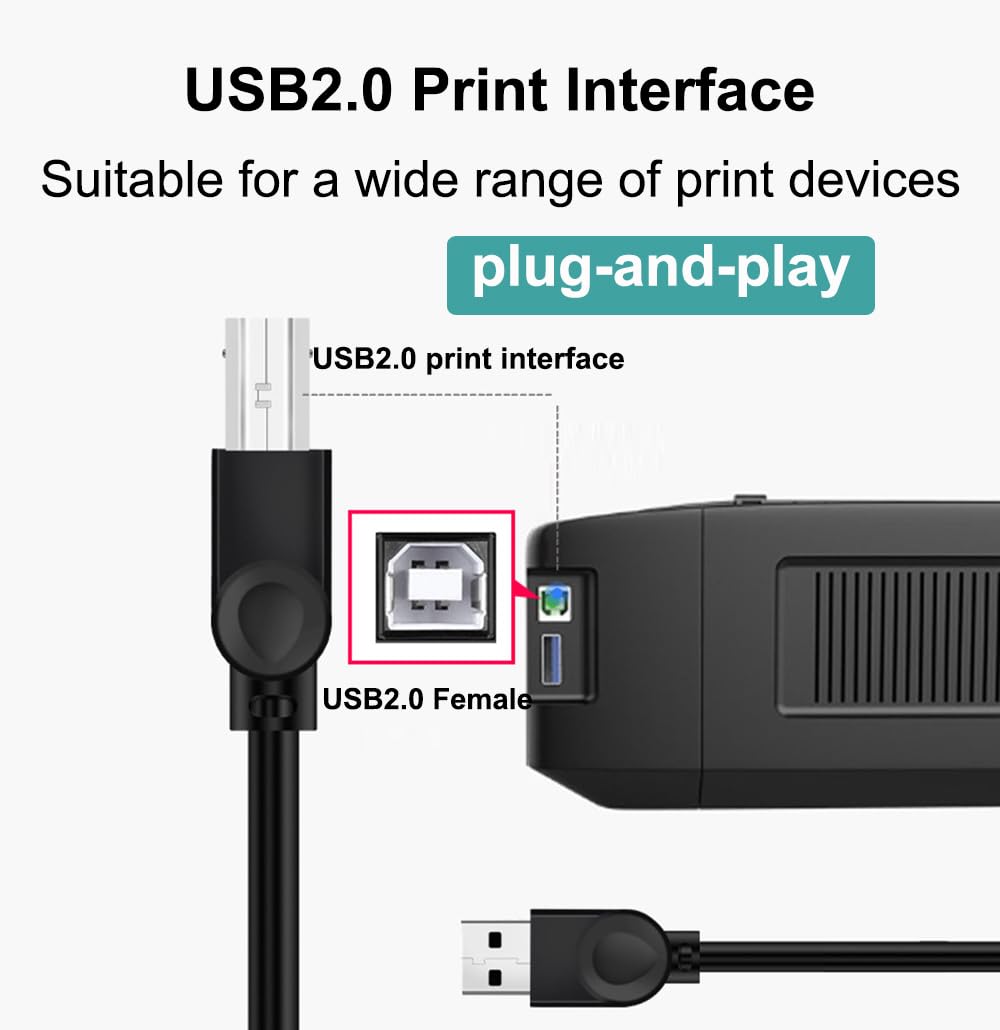 The USB 2.0 High Speed Printer Cable can transfer data at speeds up to 480 Mbps for efficient printing of photos and documents. compatible with full-speed USB 1.1 and low-speed USB 1.0. Plug and play, no need to install driver.