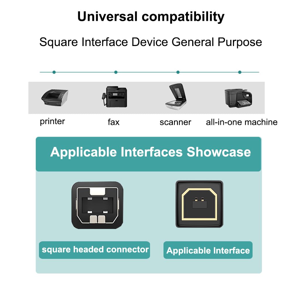 The USB 2.0 Printer Cable suit for connecting the Printers, scanners, faxes, servers, cameras, MFPs and other usb devices with the square interface to the laptop, computer device. Compatible with HP, Canon, Lexmark, Epson, Dell, Xerox, Samsung, and more.