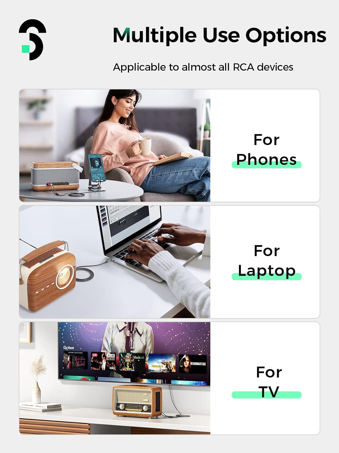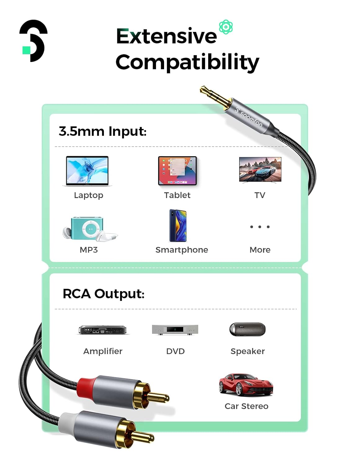 Wide compatibility: This rca to 3.5mm audio cable compatible with a variety of devices with 3.5 mm jacks or RCA plug; 3.5mm: For smartphones, tablets, MP3 players, CD players, computers, in-car AUX, etc; 2RCA (red/white): For speakers, stereo receivers, monitors, TV, amplifiers and Components, etc.