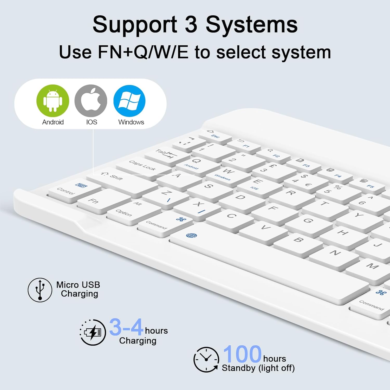 Switch Between 3 Devices Fast:Wireless Bluetooth Connection, Operating distance up to 10 meters. Just press Fn +Q/W/E to switch between 3 devices instantly. To make it even easier, every time you connect this keyboard with your device, it remembers the device so you can start typing instantly. Convenient for you to type at home, office, or the outside.