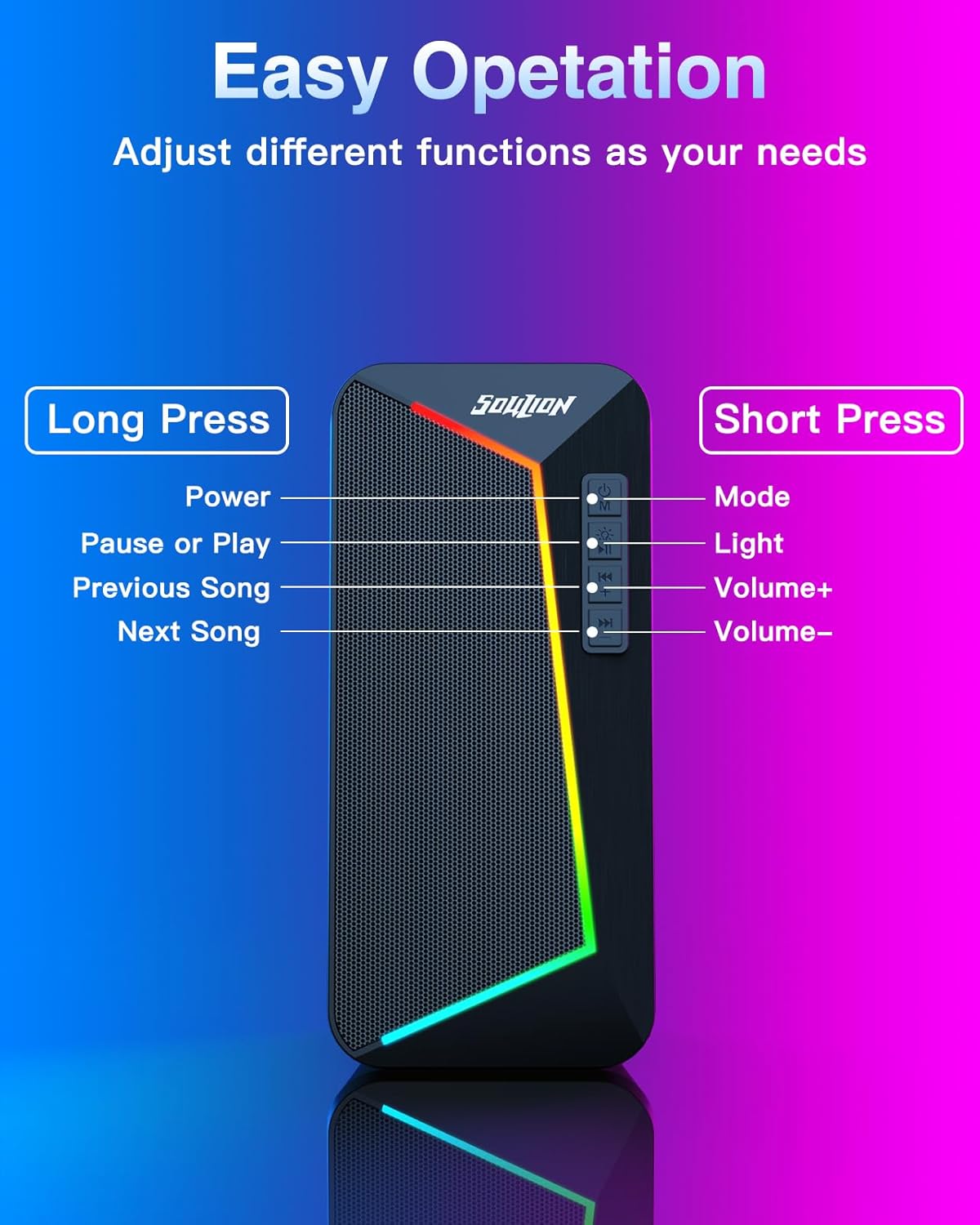 [Easy Control Button]: There are 4 touch button on the desktop speakers, you can control the volume and LED lights directly that make adjust the volume easy and accurate.