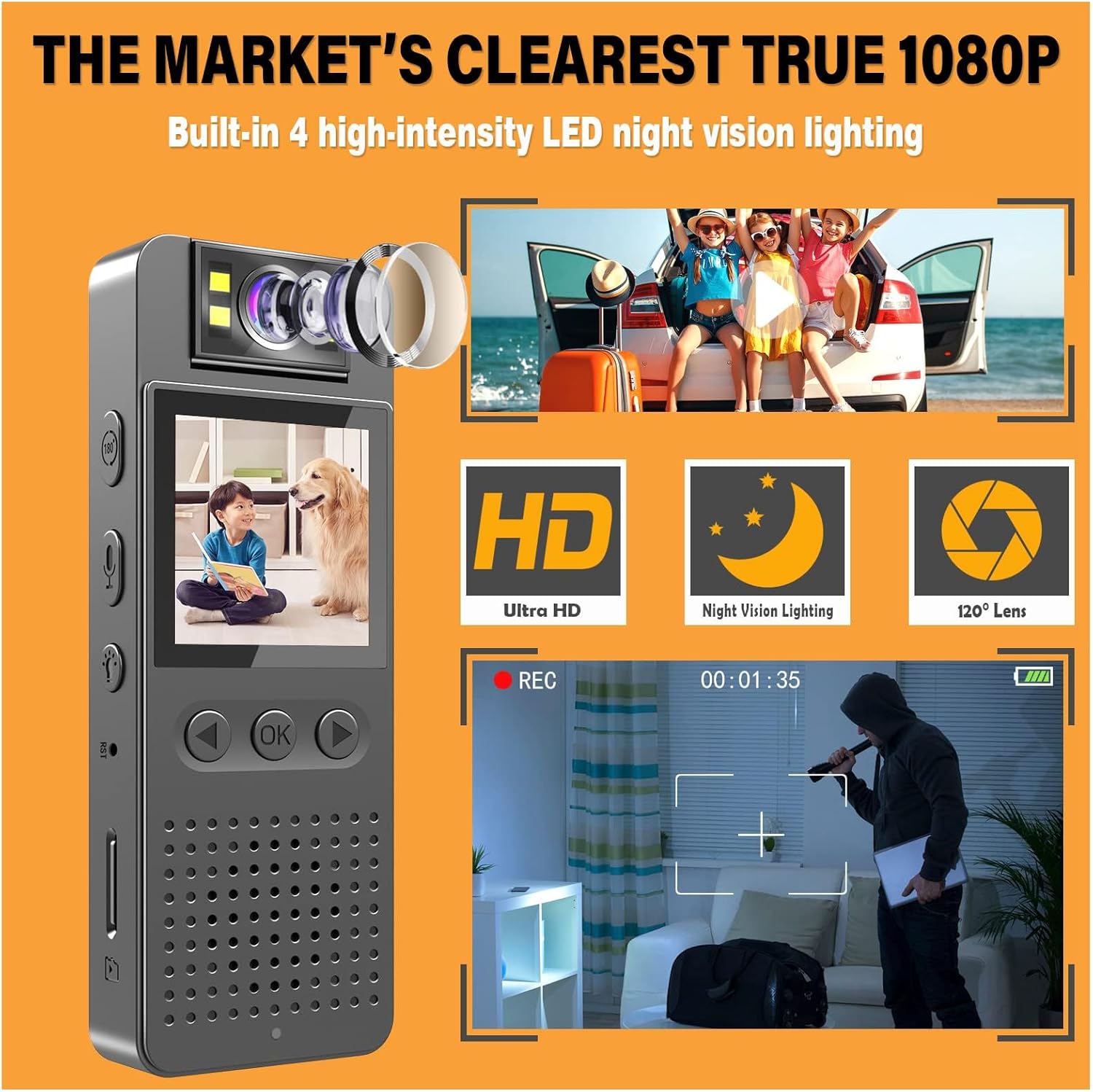 【1080P Pocket Camcorder&180° rotatable lens】The bodycam records clear 1080P HD video footage. Enjoy Full HD recording capabilities and rest assured during the night time 4pcs LED fill lights that capture clear footage up to 5m/16ft away in pitch-black darkness.The 180° rotatable lens allows you to adjust the angle of video shooting at will.