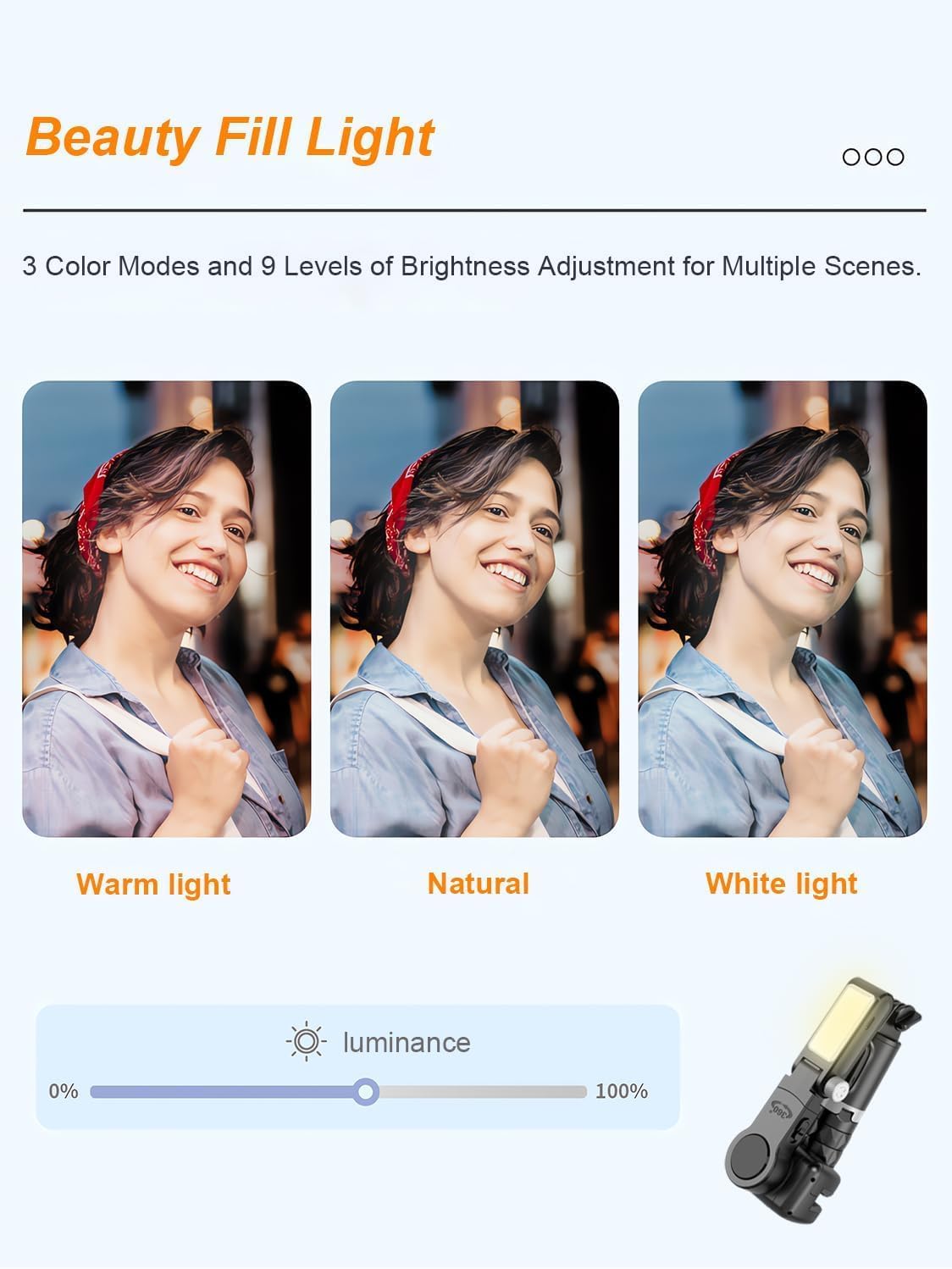 Front and back fill light has three light modes (warm light, natural light and white light), each with three levels of brightness.Fill light before and after, balance steady shooting and beauty live streaming.Our Selfie Sticks with Lights and extendable five-section aluminum alloy rod,The clip head can be both horizontal and vertical and is deep enough to securely grip the phone on it.