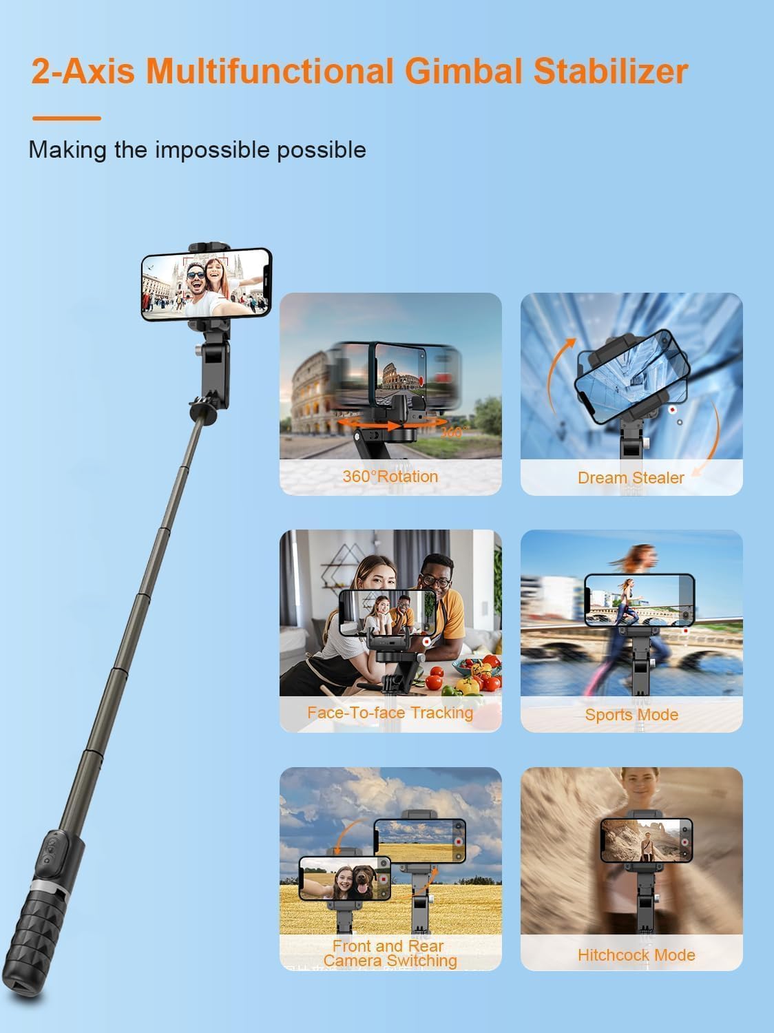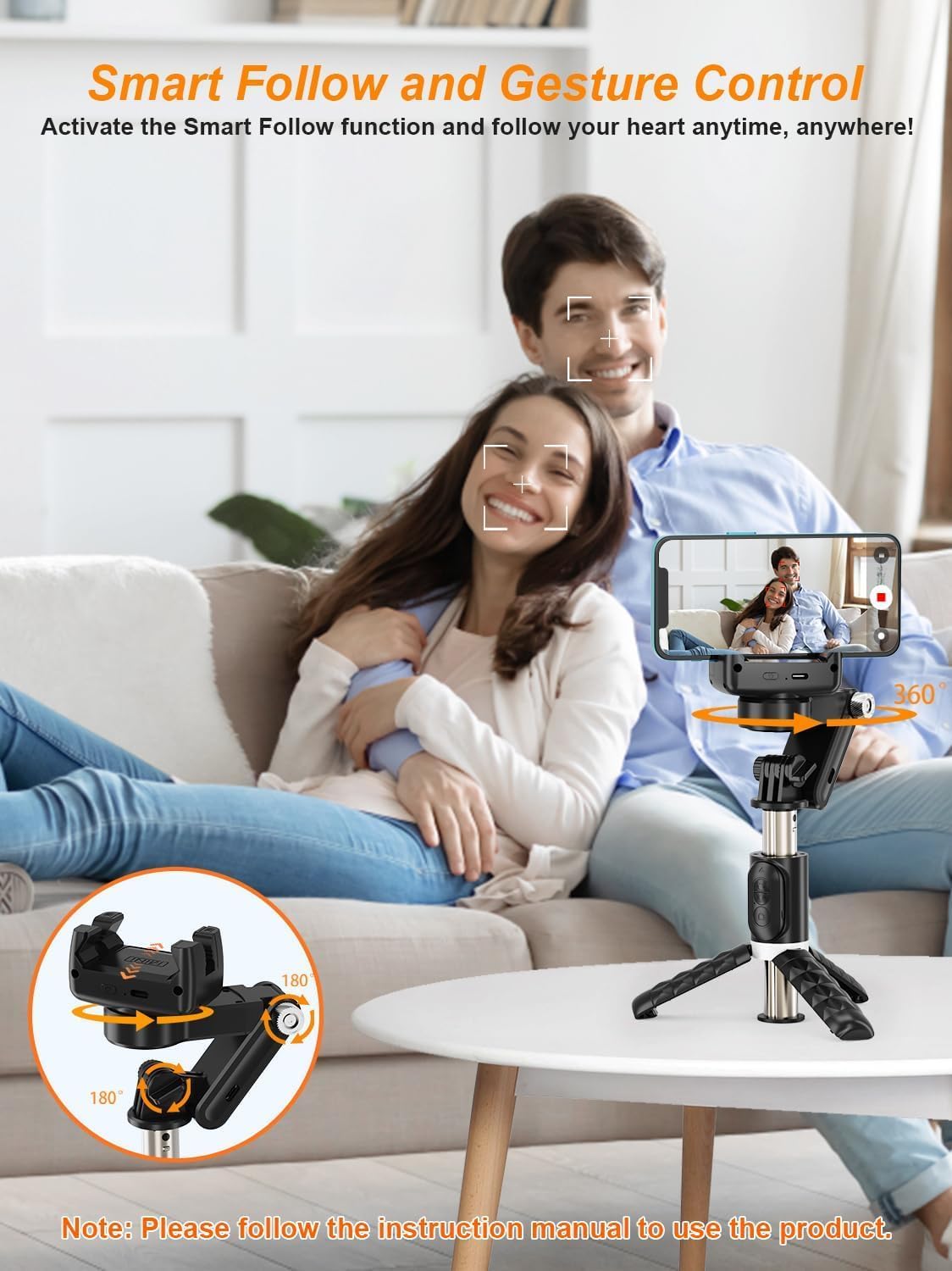 Gimbal Stabilizer, Extendable Auto Balance Selfie Stick Tripod, 360° Face Tracking Stand, 2-Axis Multifunction Remote, for iPhone/smart phone