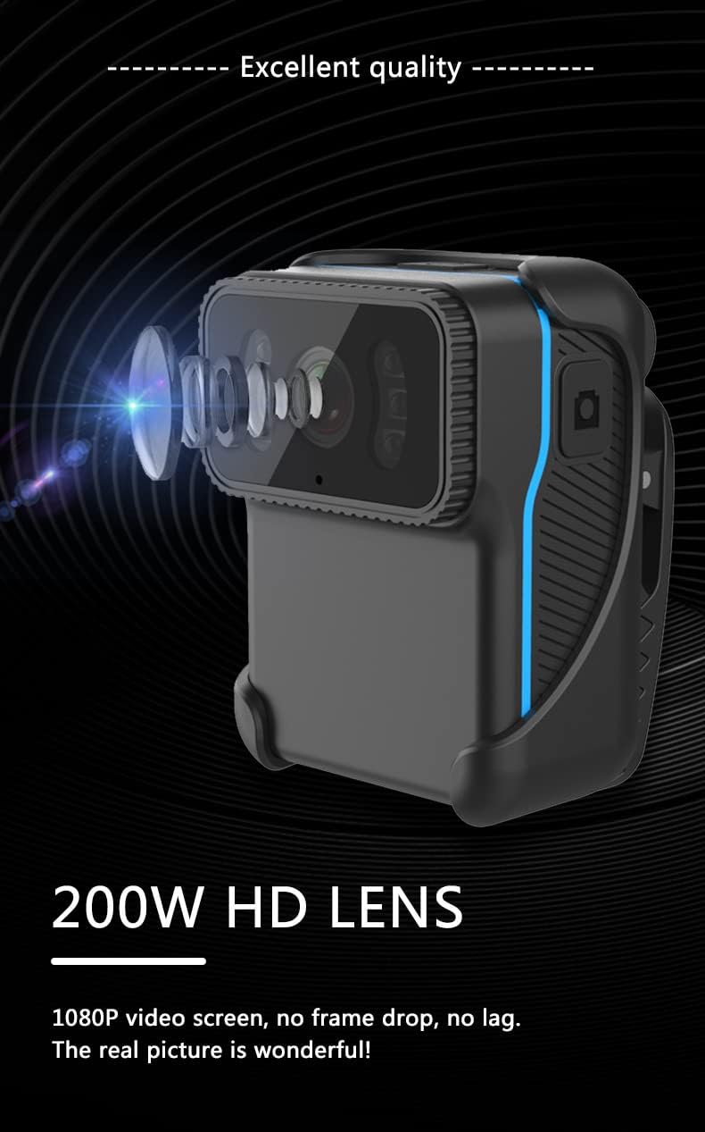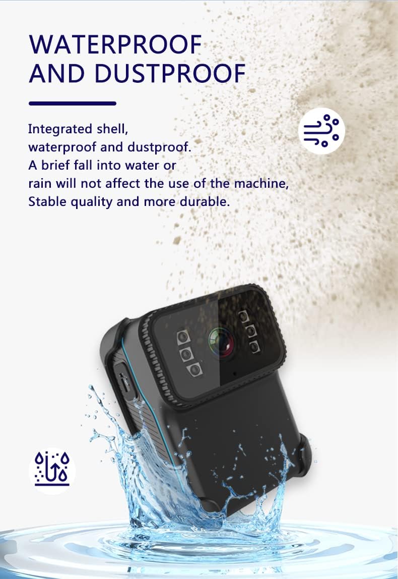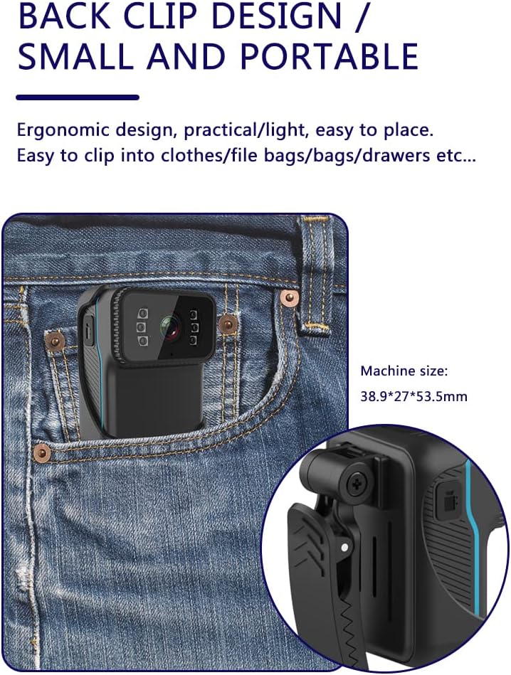 Wifi Connection & Lightweight and Portable: The portable bodycam supports Wifi connection, use the App: “Sports Camera” to view videos and play them more conveniently. The camera weighs only 48 grams, and the smallest body camera comes with a stable clip that can be attached to a polo shirt pocket or belt.Ultra HD 1080P and External Storage: The compact camera is equipped with a 140° wide-angle lens, which can shoot full HD 1080P video. At the same time, it is equipped with infrared LEDs, which can capture clear pictures up to 13 feet away at night. The night vision body camera adopts external micro SD card storage, up to 256G TF card (including 64G TF card). After recording, you can also connect to a computer or mobile phone via a data cable to view the file.Easy to operate and waterproof and dustproof: The mini police body cam has a unique ultra-compact and ultra-thin design with a waterproof and dustproof case. It has three buttons, one for switching, one for video recording (synchronized with sound), and one for taking pictures.LONG BATTERY LIFE: This small body cam with clip comes with a built-in high-quality 900mAh rechargeable battery, which can provide 5-6 hours of video recording. It supports charging while recording, so you can use it while the mini camera is plugged into a power bank.Video With time/date Stamp&Loop recordingAfter using the WIFI hotspot to connect the mobile phone, you can turn on the time watermark in the APP and synchronize the mobile phone time.Loop recording can be turned on or off on APP.