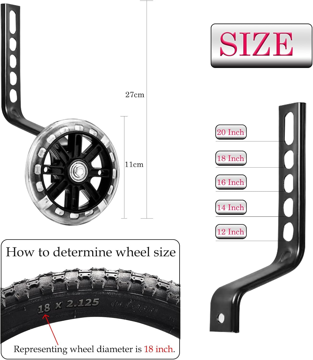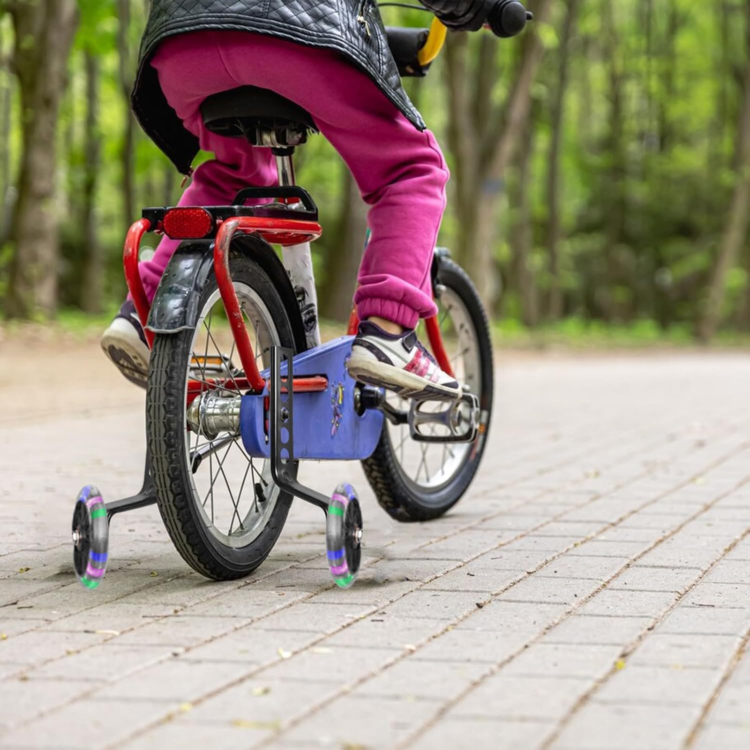 🚴【PROVIDE STABLE SUPPORT】 Our bike stabilizers feature a robust triangle design that attaches securely to the rear of the bike, providing extra balance and stability for young learners. The wheels will glow when turned quickly, more visible in the dark, and children will be more interested in riding.