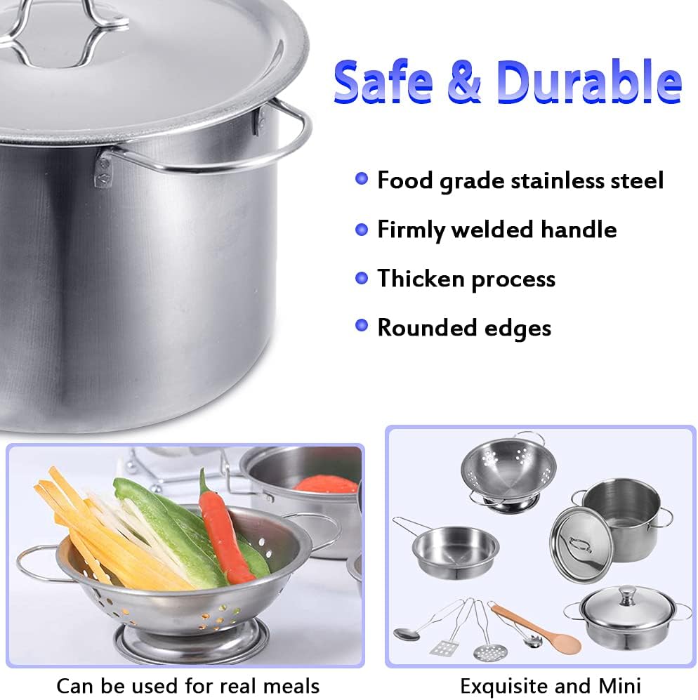 ❤【Premium Quality & Child safe】The play pots and pans set is unmatched durability, adopts fine hand polished , smooth edges won’t hurt your little angel’s little hands.Handles is welded firmly, not easy to break,can be use on dishwasher safe and Durable.