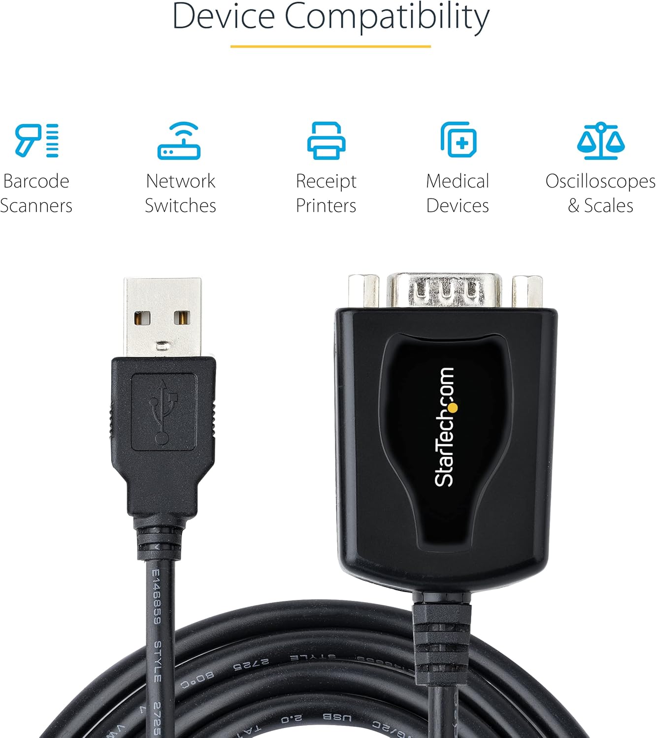 DEVICE COMPATIBILITY: Use this USB to RS232 serial adapter to reliably connect, configure, and monitor serial devices. Compatible with barcode readers/scanners, networks switches, receipt printers, PLCs, medical devices, oscilloscopes, scales, etc.