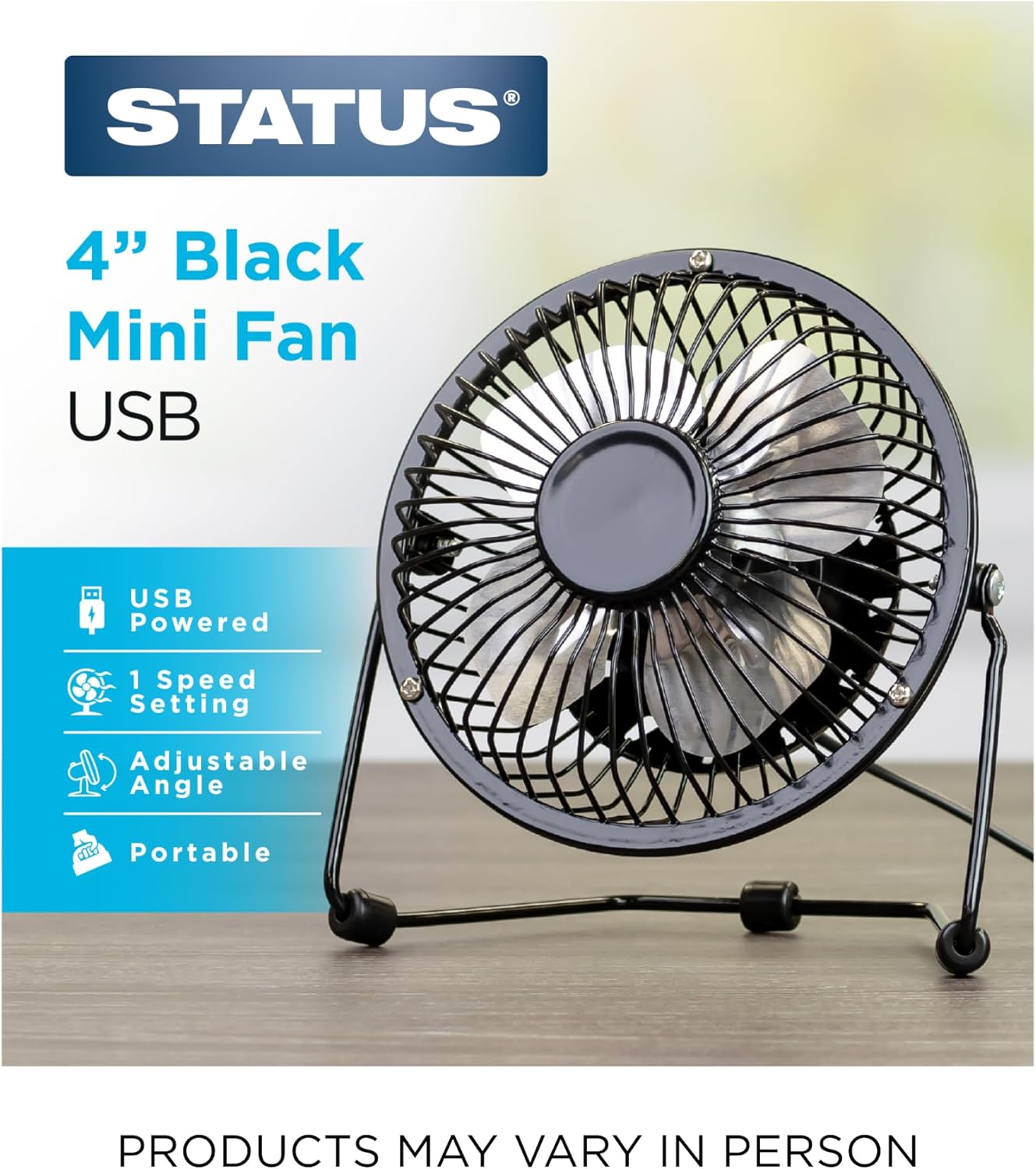Status 4 Inch USB Desk Fan, Mini Portable, Single Speed, Black, Compact Personal Cooling Fan for Office Travel (SUSBBLKWFAN1PKB4)