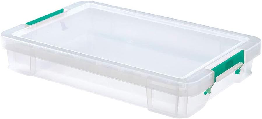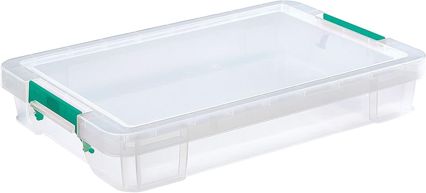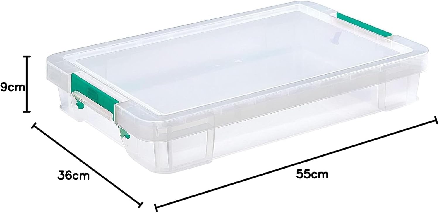 Ideal for A3 sized paper and cutting mats for project material storage. Not too bulky and good fitting lid with clips to help keep everything secure