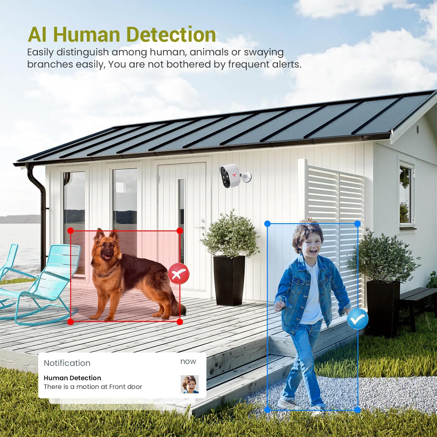 AI-Powered Human Detection: Built-in PIR motion sensor ensures accurate real-time notifications upon motion detection. With AI-powered human detection, receive alerts only when a person is nearby, avoiding unnecessary disturbances from pets or vehicles.