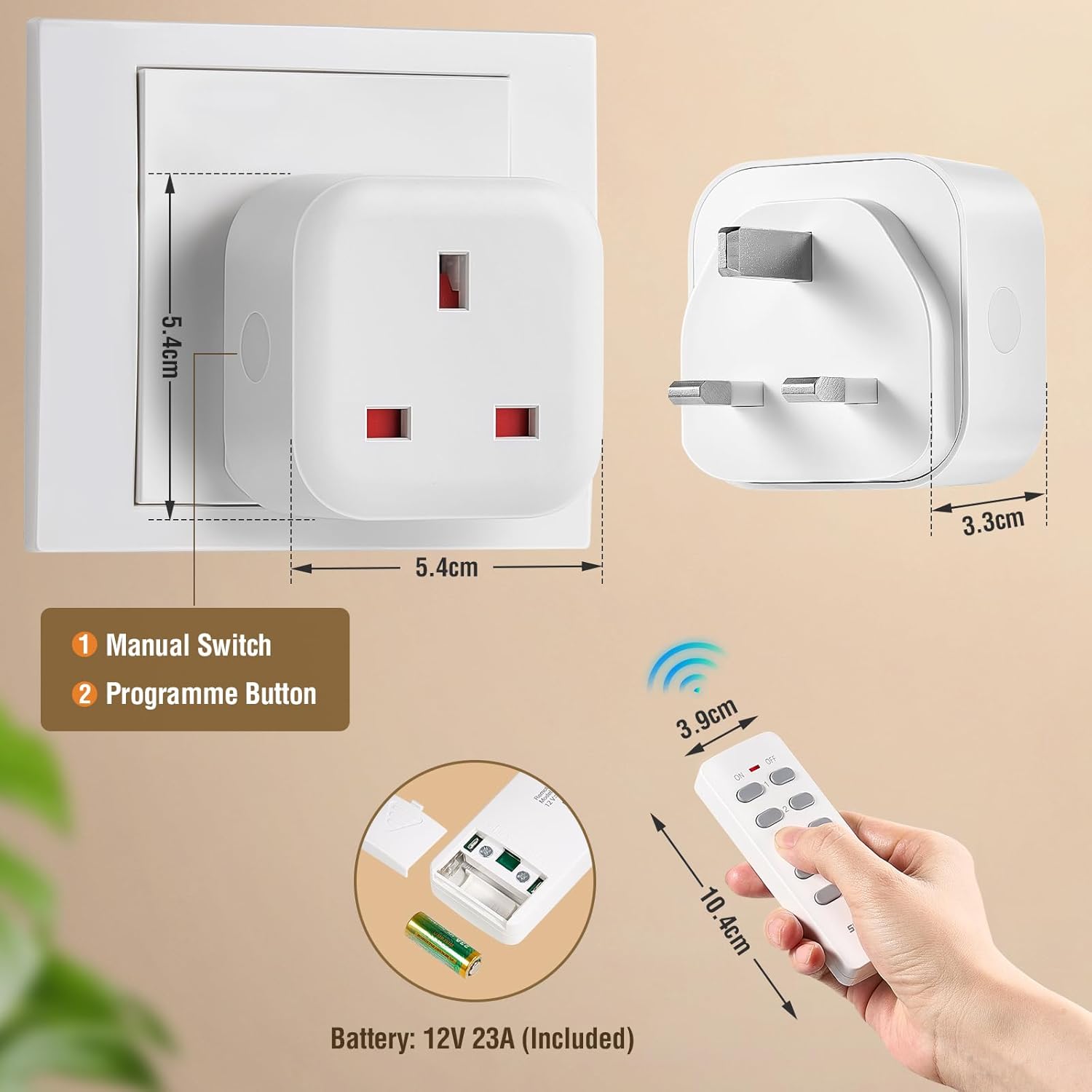 Review Of: Suraielec Set Of 5 x Remote Control Plug Sockets With 2 x Remote ControlsI canรขยยt tell you how useful these are at Christmas when you have all manner of fairy lights and decorations plugged in.You simply insert one of the plug sockets into the wall, turn on the power, insert the plug of your appliance into it and then just turn the appliance on and off with the remote.The build quality of the plugs seems good. The remotes look a bit basic and old fashioned, but itรขยยs obvious how they work and they do the job. They even come with batteries. Each remote can control all 5 sockets and you simply press the on or off buttons next to the number.Would recommend as long as you have space to put plug on top of plug.