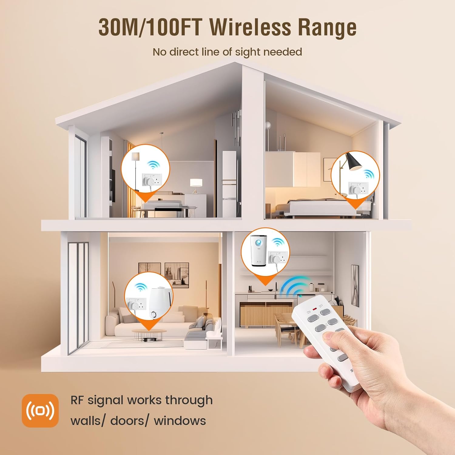 Long Range Remote Control (30M/100Ft): The remote control plugs delivers exceptional 100 ft coverage through walls, ideal for the elderly, pregnant women, and those with mobility challenges. The included remote (12V battery included) allows easy access to control 5 socket configurations without physical effort