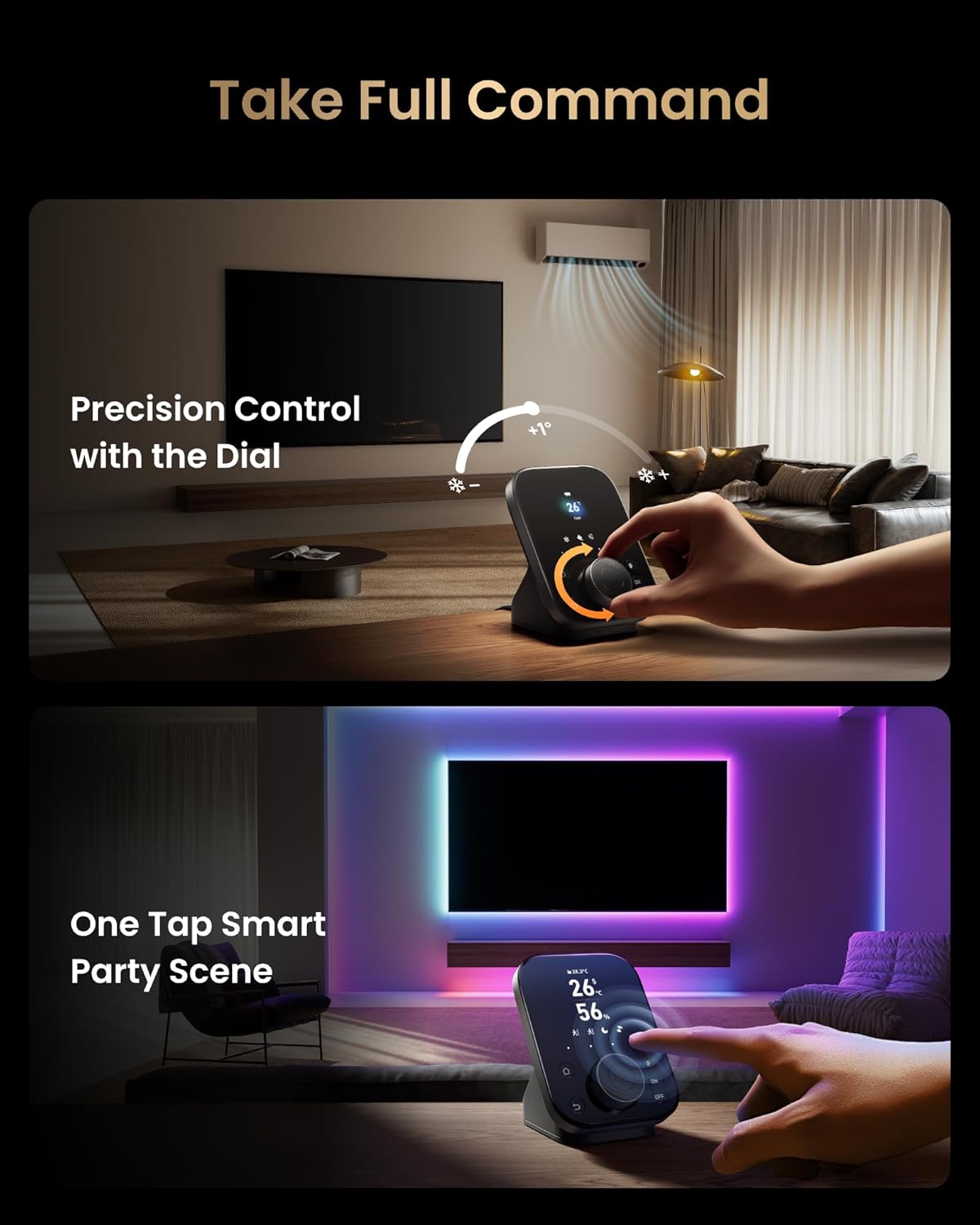 Unique dial design for effortless family use: Features our exclusive Dial Master rotary control and physical buttons. Adjust air conditioner temperature or lighting brightness with precision—just rotate to fine-tune by 1°C. Four customizable buttons let you instantly switch between smart scenes like Away, Home, or Movie Mode, making it easy for both kids and seniors to use.
