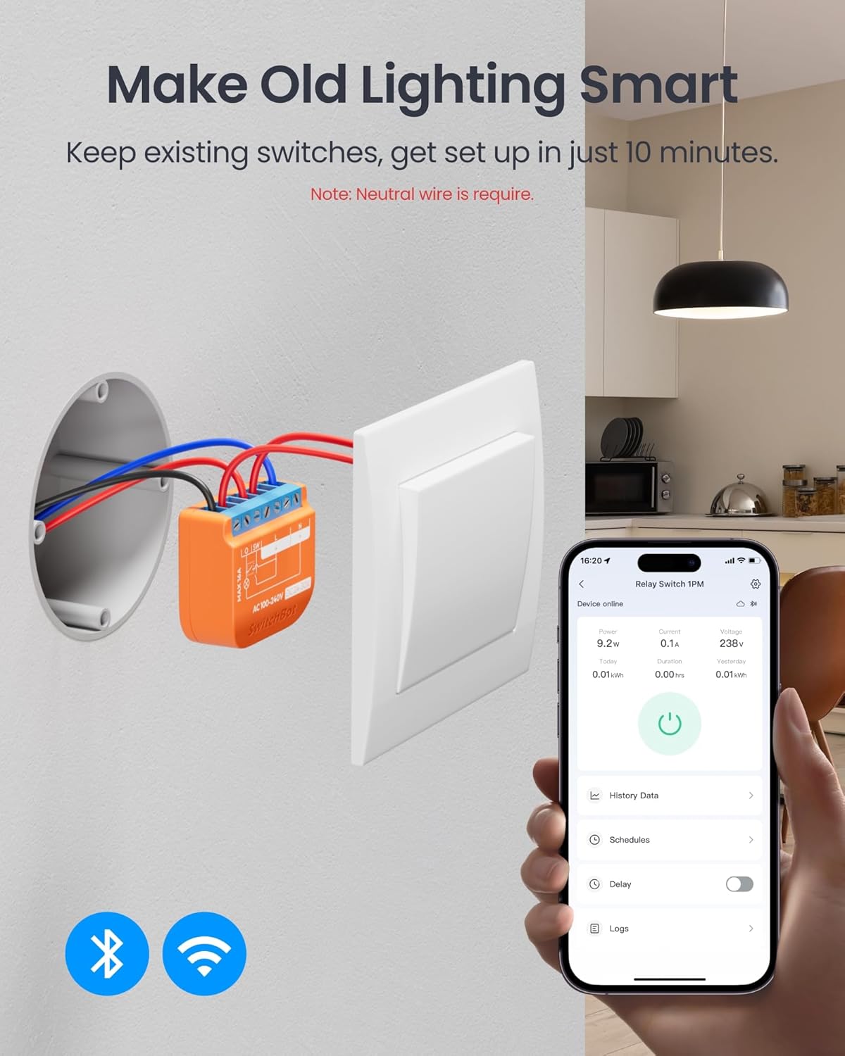 I requested this as I was replacing the lighting in my garage from two 6Ft double fluorescent fittings to two new LED battens and I wanted them to be smart controlled so I could turn the lights on before going in the garage.To install this you do need a neutral wire which I was lucky enough to have as the old lights that were installed were double switched and the neutral wire had been used as the live feed to the 2nd switch (tsk, tsk), so I just connected it to the neutral from the fitting that went back to the consumer unit.You can either use the existing switch with this or no switch, I went the no switch option as I only had a 20mm pattress box on the wall and with the switch this would not fit but it does fit with a blanking plate which I had so I went that route. I can always install a deeper box and a switch later should I want one. It was easy to install with just a couple of wire connections. You then have to download the app, this they could have made easier as there are QR codes on the instructions but they just link to a support page and not the app.Anyway I found the app and downloaded it, the app worked and it recognised the relay but for some reason would not connect to it and kept failing I tried several times over a period of a few hours and it would just not connect. I then decided to download the app onto my latest phone, (I keep an old phone just for control apps) and it connected straightaway, so I would say it was a problem with the old Android version on my old phone. The linking of the account to Alexa was straightforward so I can now control it that way.This does have a power monitoring feature which I do not use as 2 LED battens are not going to use a lot anyway and are only occasionally on throughout the day but I suppose it would come in handy if used for something other than lights.In conclusion, easy to install and works well.