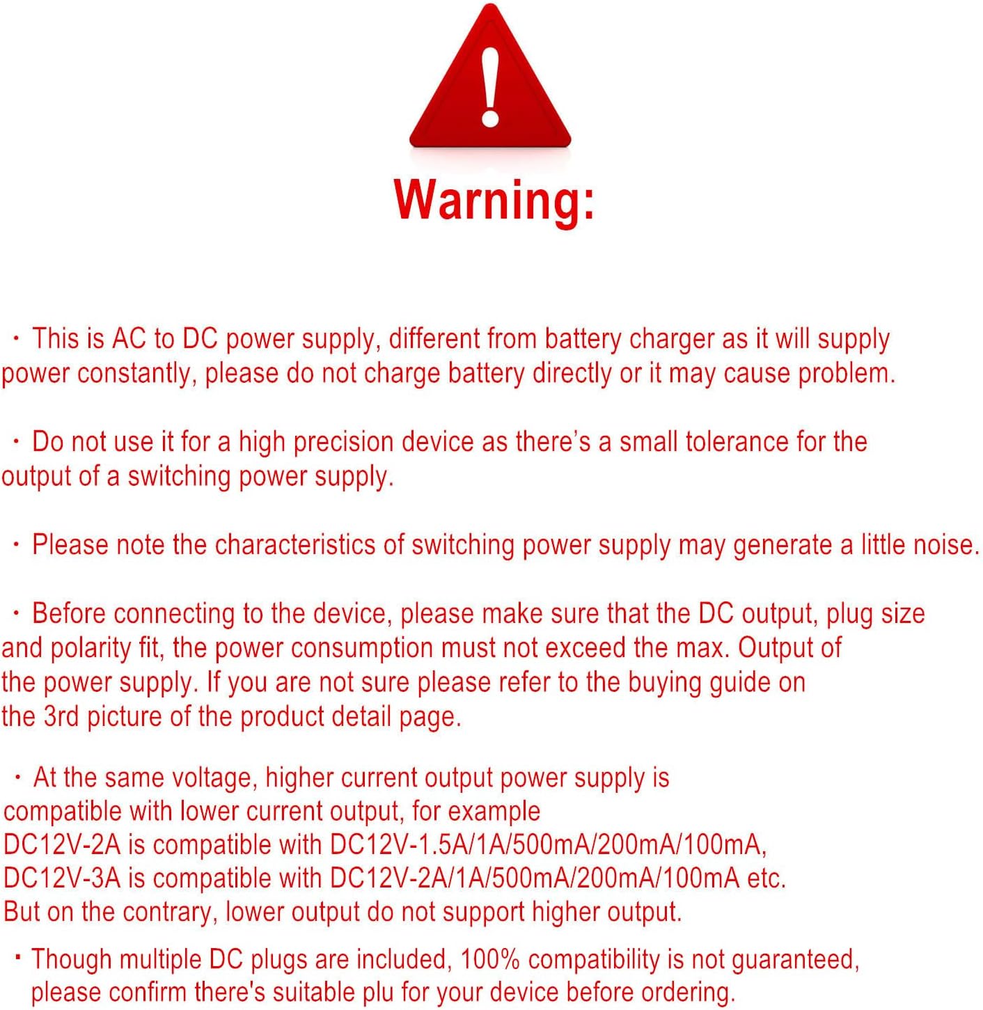[Warning] Please check the DC socket size, power consumption, polarity of the device to make sure the adapter fit before ordering, or it may not work or cause problem. (To ensure good performance and durability, try not to exceed 80% of the total output of the adapter for long time use)