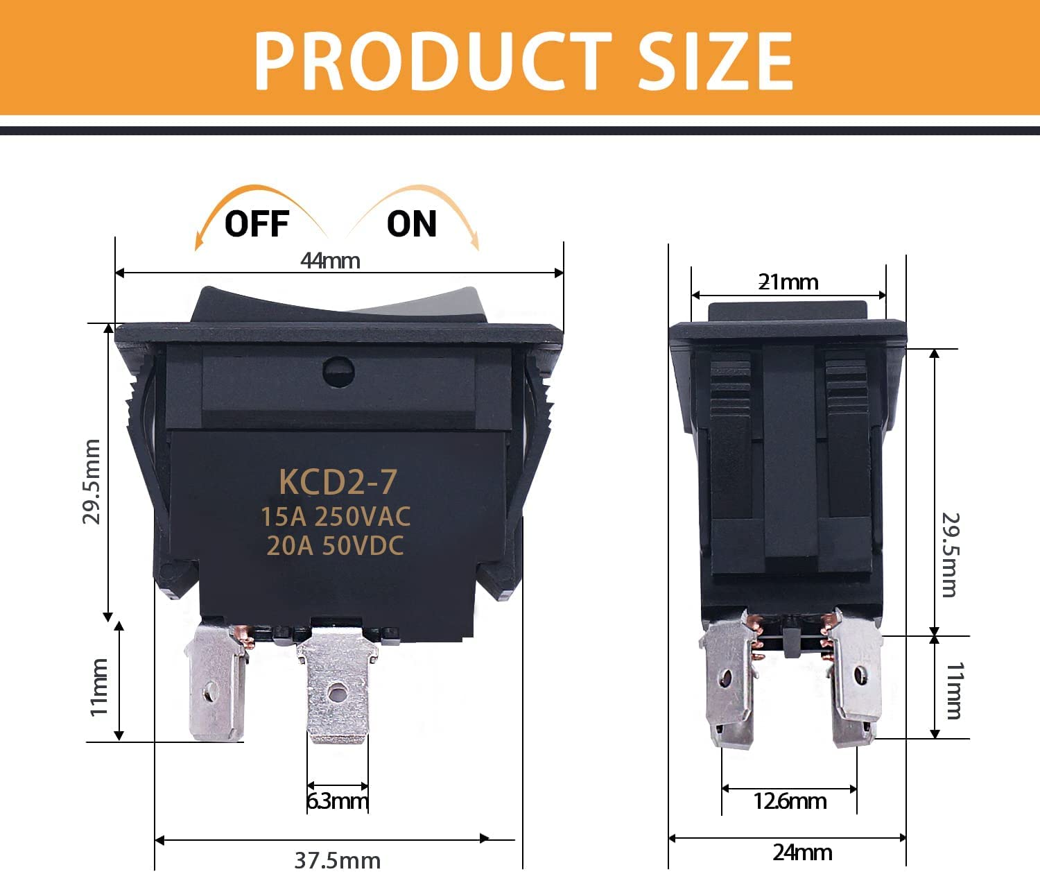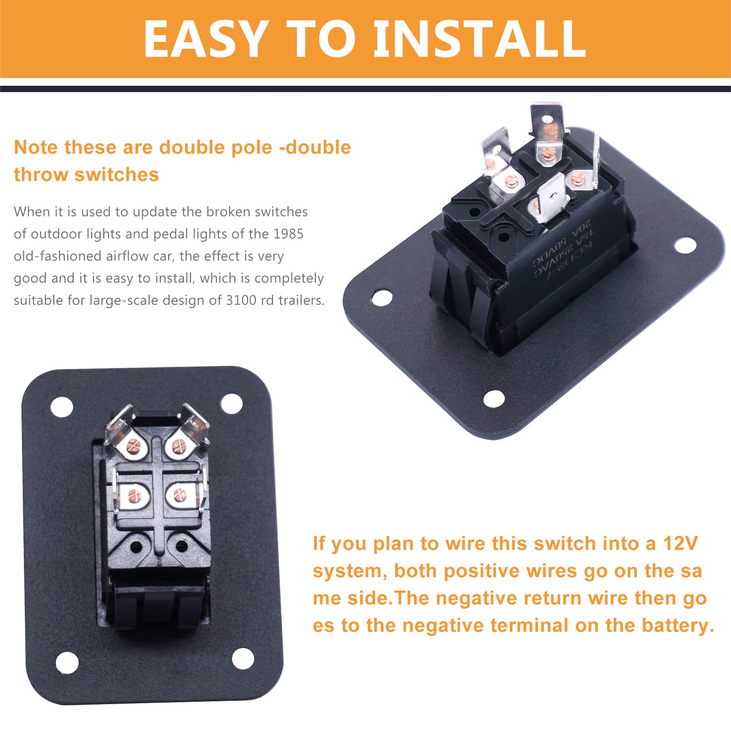 Rocker switch adopts snap-in design,easy to install.Terminal Type:DPST , easy to turn ON/ OFF.Rocker switches are commonly used for lights, pumps, fans, vents, and many other uses in RVs, Buses, Horse Trailer Conversions, Haulers, Travel Trailers, Boats and more.