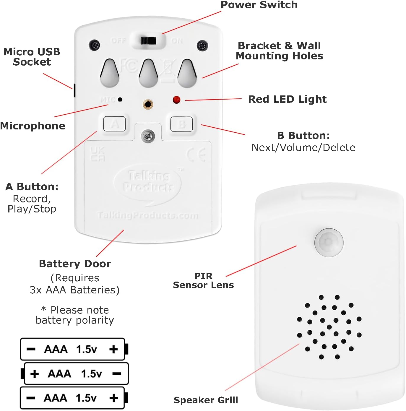 Download MP3 sound files with speech, music or any sound effect.Record your own voice messages using the built-in microphone.Re-record, update and change your messages as many times as you wish.Record and store multiple MP3 files on the internal memory.Two playback settings: Single-Track or Multi-Track Loop feature.In Multi-Track Mode one track will play after each activation, (in file name order).Multi-Track Mode will NOT playback randomly.3 volume settings: Low, Medium and High.Includes wall mounting holes and an optional ball-joint wall mounting bracket.Two power supply options: 3x AAA Batteries or Mains Power Adapter, (bought separately). Micro USB Socket will support a 5 Volt DC Power Adapter, (bought separately).USB socket also used for MP3 sound file transfer. (USB Cable supplied).Audio playback format: MP3 format only.Sensor activation distance: Up to 4 metres with a 120 Degree Angle.Internal Memory: 4MB.Recording time: Approx. 4 minutes, (calculated at 128Kbps MONO bitrate).Playback time up to 8 minutes, (calculated at 64Kbps MONO bitrate).Battery Life: Approx. 24 hours.