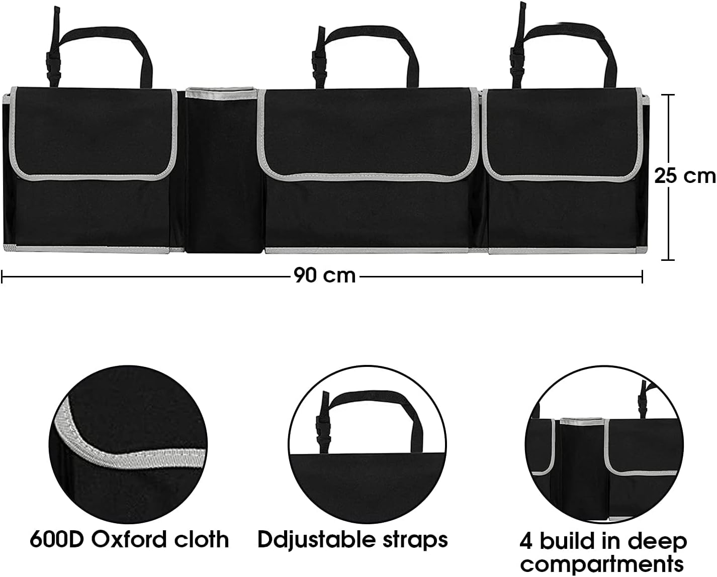 𝐒𝐀𝐕𝐈𝐍𝐆 𝐒𝐏𝐀𝐂𝐄: The car storage organiser has extra organisational space is solved with a folding organiser that provides extra storage in your car. You need not worry about broken and lost items. Its size is 90x12x25cm