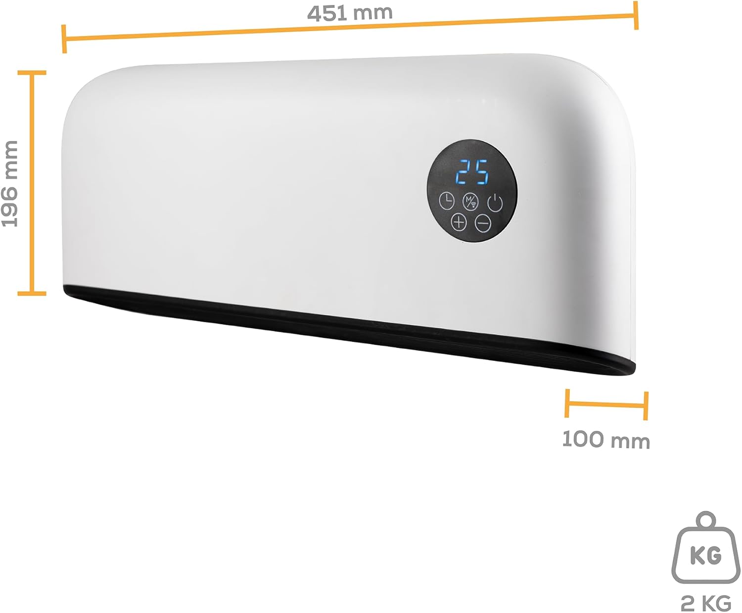 Dimensions: 450 x 100 x 196mm 220-240 V AC. 50/60Hz 2000w White 2KG