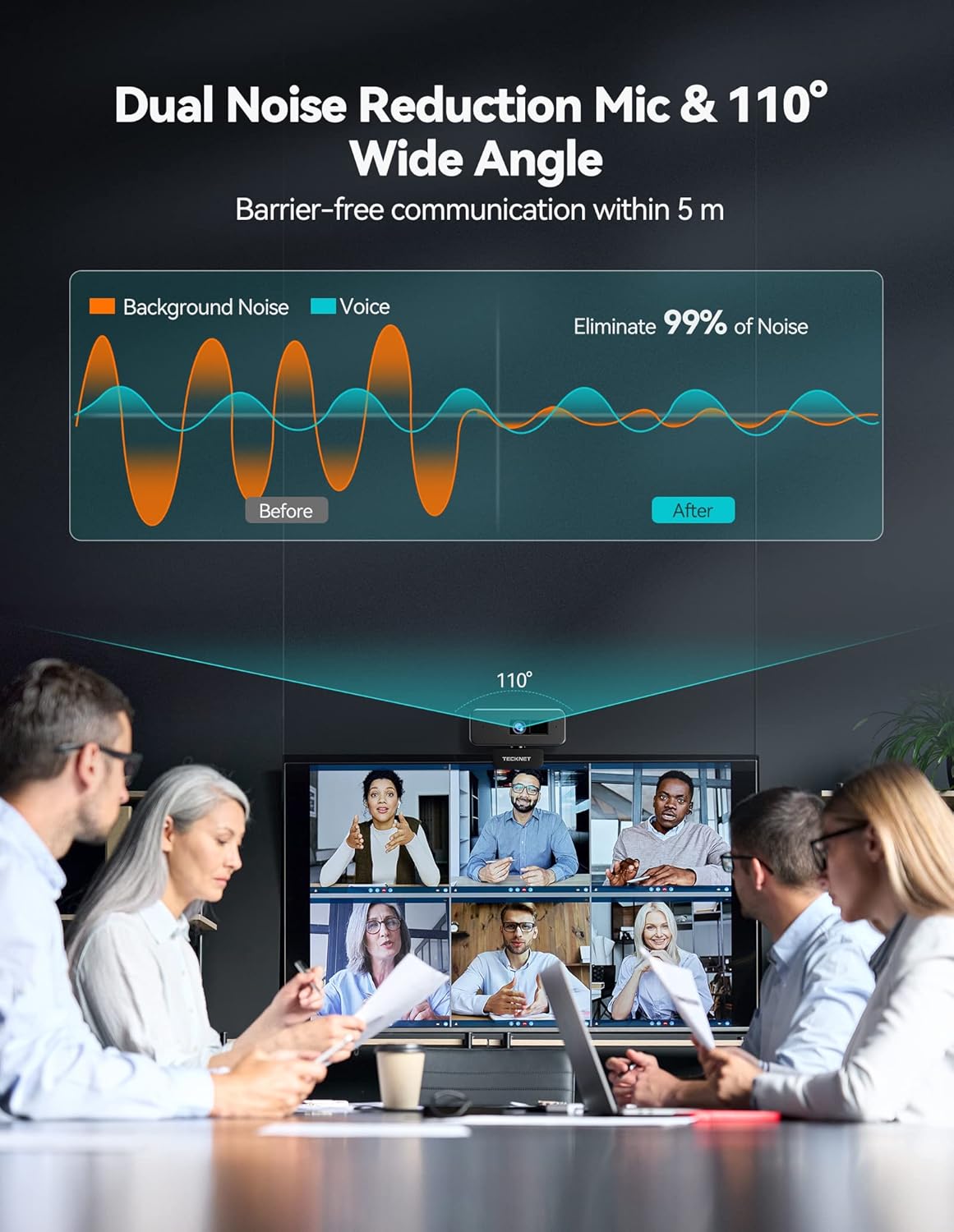 📷【Built-in Noise-Cancelling Microphone】 Equipped with two dual-microphones and intelligent voice noise reduction processing, this pc webcam captures your voice within a range of 5-10 meters while filtering out any background noise, resulting in barrier-free communication and smoother conversations. The noise-cancelling microphone also enables you to enjoy clearer voice quality, enhancing the overall video conferencing experience.