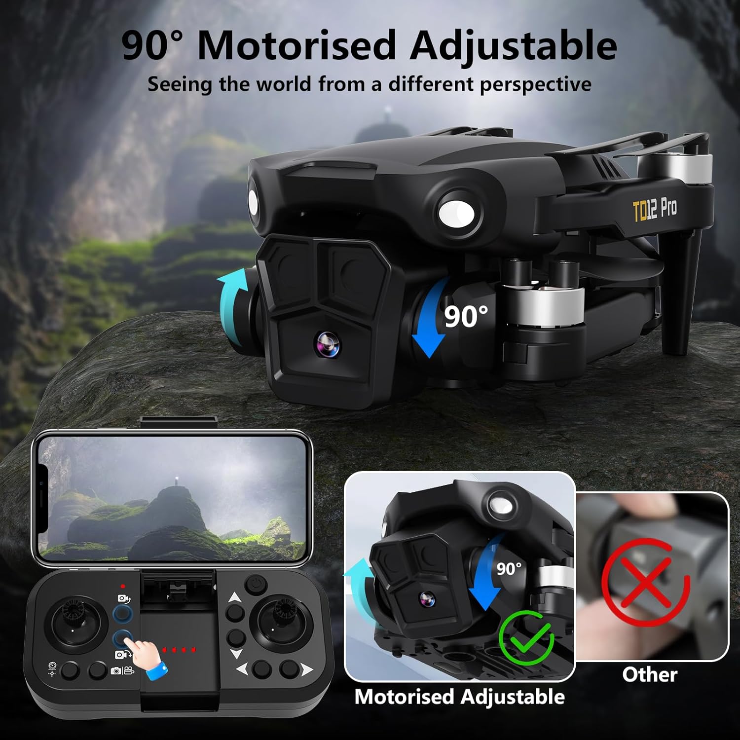 1080P HD Camera and 90° Motorised Adjustment: TD12Pro drone with camera features 1080P shooting quality, allowing you to immerse yourself in aerial footage and capture every moment from the air with amazing clarity and detail. Adult drone is also equipped with a 90° motorised adjustable camera, when the drone is flying in the air, you can easily adjust the angle of the camera by simply using the remote control, don’t miss every special viewpoint.