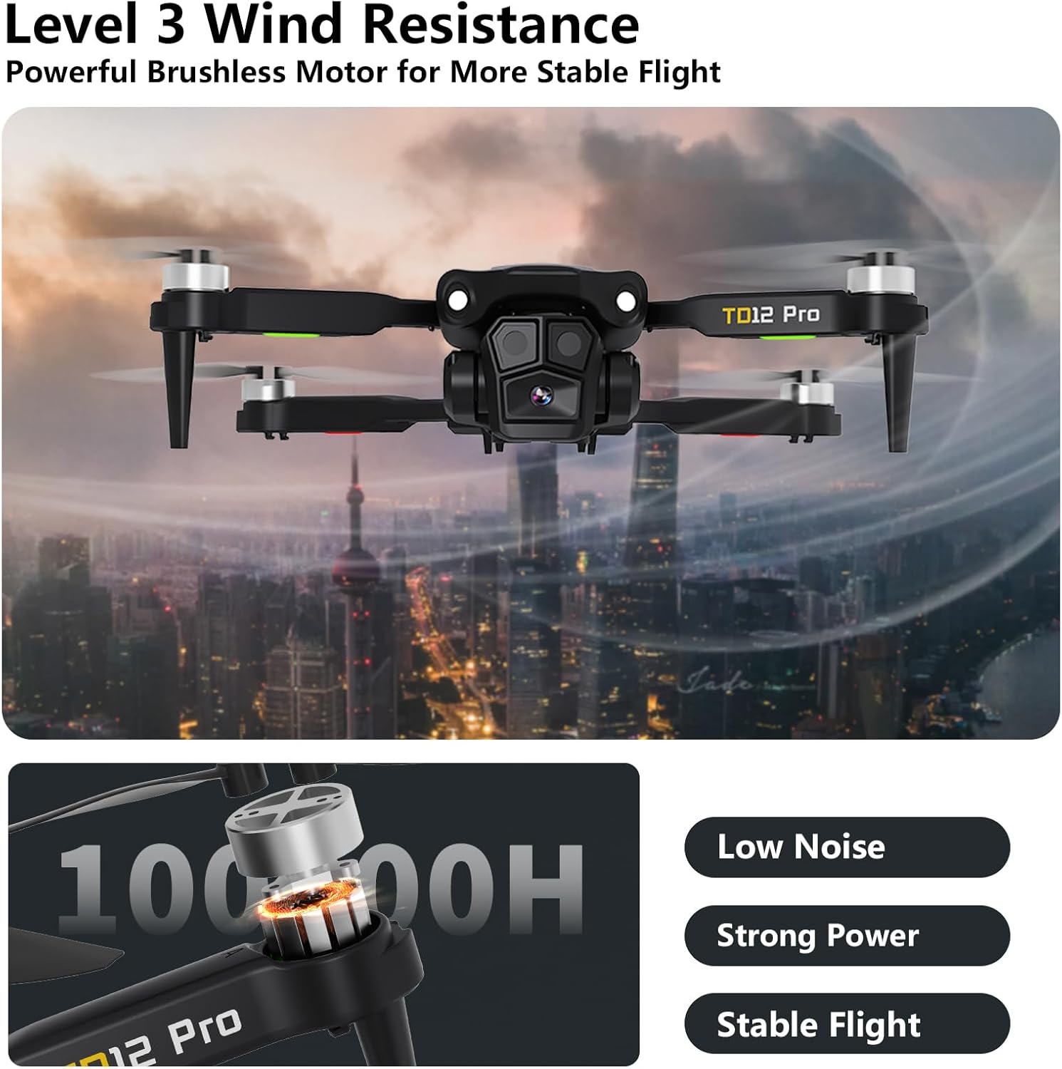 Powerful Brushless Motors: TD12Pro RC drone is equipped with 4 powerful brushless motors. Tens of thousands of tests have been conducted to provide customers with a more powerful, stable and quieter flying experience. The motors rotate at 10,000 rpm and offer strong performance, speed and power as well as a longer lifespan and reduced maintenance costs.